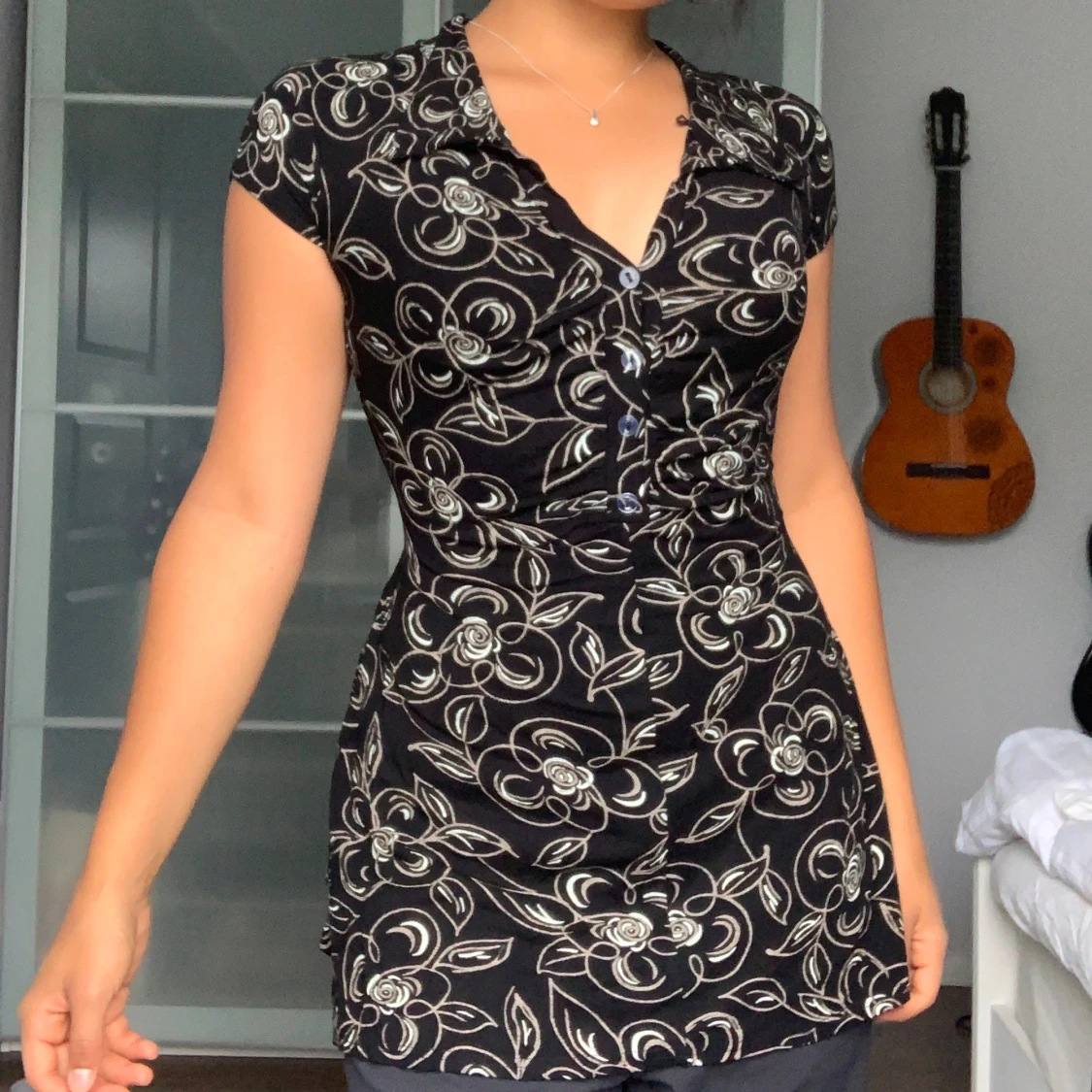 Säljer en superfin svart klänning från Sisters Point med ett blommigt mönster i vitt. Klänningen har korta ärmar och en v-ringad hals. Den är perfekt för både vardag och fest! 💐