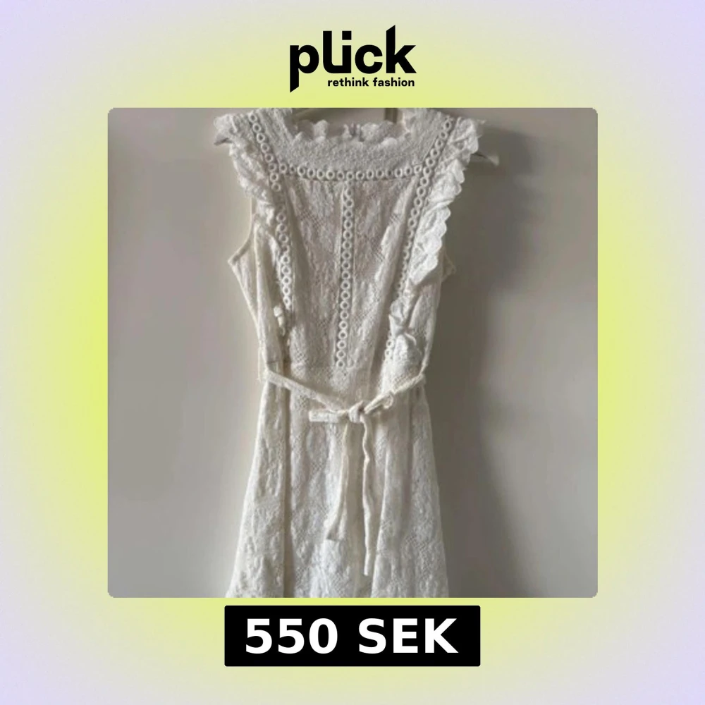 Superfin vit spetsklänning från Dennis Maglic med volangdetaljer och knytband i midjan. Klänningen är ärmlös, har rund halsringning och vackra spetsmönster över hela plagget. Perfekt för sommarens alla tillfällen! Använt en gång under studenten, men kvaliten är som ny.
