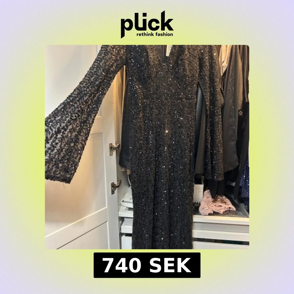 Säljer en lång svart klänning från Vera & Lucy med v-ringning och långa ärmar. Klänningen är täckt av svarta paljetter som ger en glittrig look och har en figurnära passform. Perfekt för dig som vill sticka ut på festen!