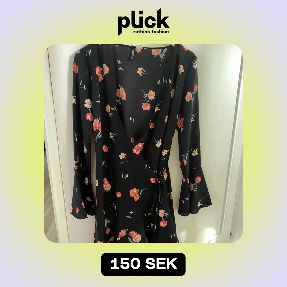 Säljer en superfin svart klänning från H&M Divided med blommigt mönster i rött och rosa. Klänningen har en omlott-design och långa ärmar med lätt utsvängda ärmslut. Perfekt för både vardag och fest!