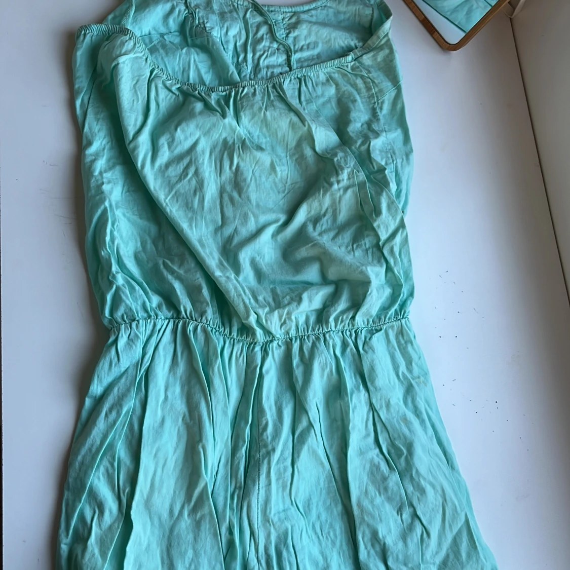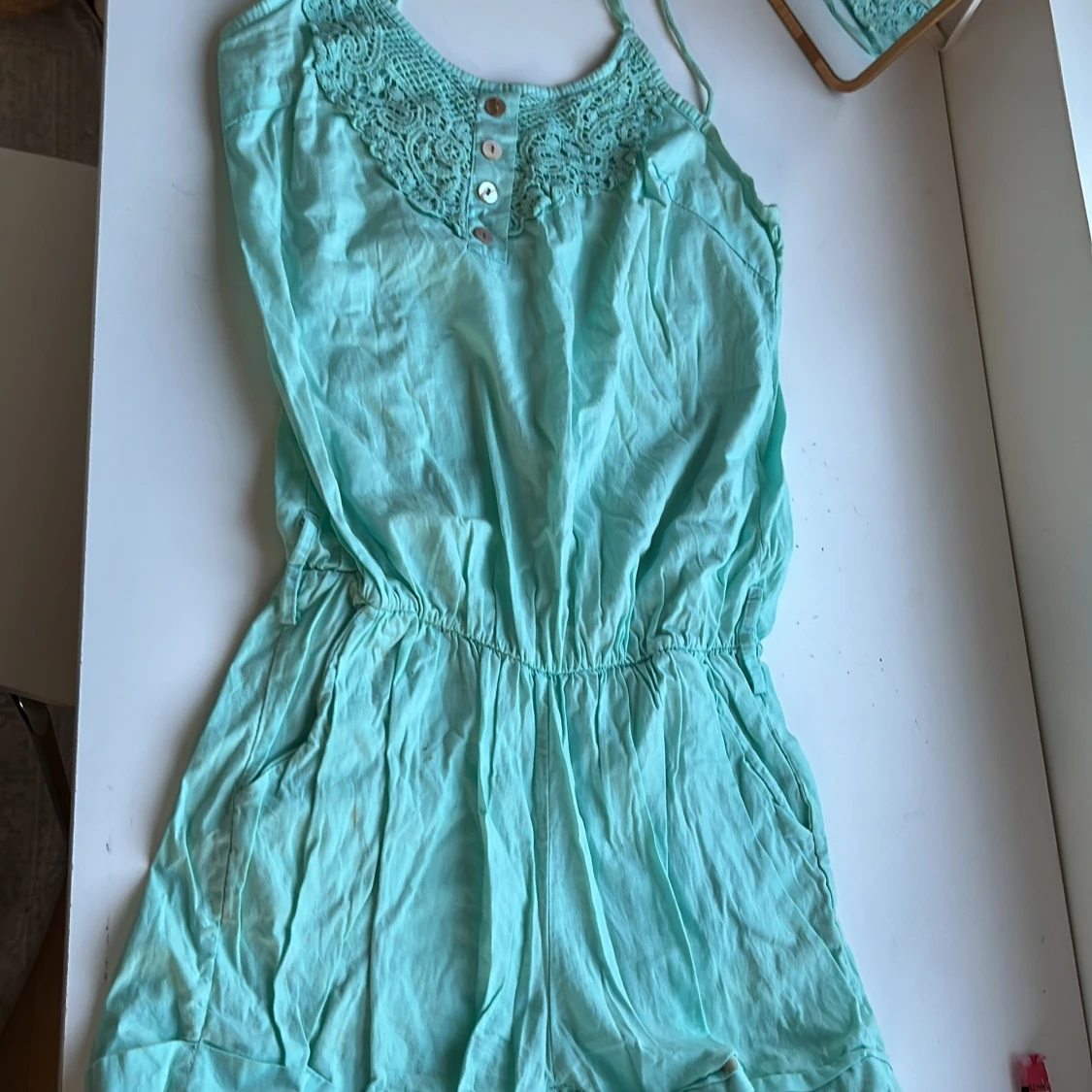 Säljer en söt turkos klänning med spetsdetaljer vid halsringningen och knappar framtill. Klänningen har en elastisk midja och är ärmlös, perfekt för varma dagar. Den har en avslappnad passform och är gjord i ett lätt material.