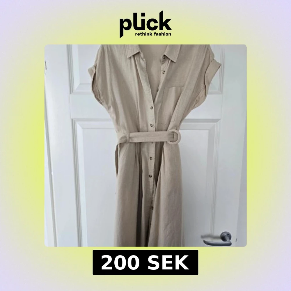 Stilren beige skjortklänning från Orsay med knappar framtill, korta ärmar och tillhörande bälte i midjan. Klänningen har klassisk krage och bröstficka, perfekt för en avslappnad men ändå chic look. Helt ny/ej använd. Perfekt för sommaren.