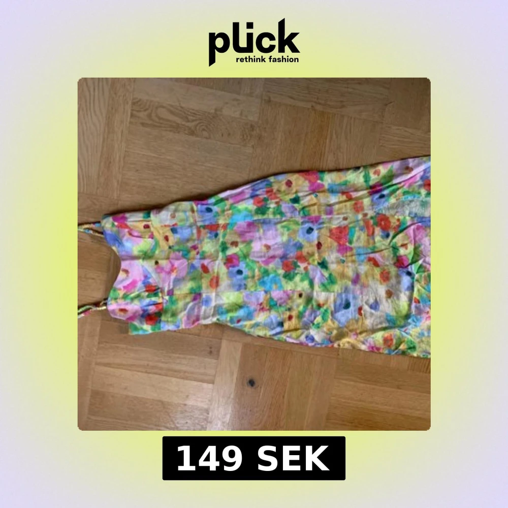 Säljer en färgglad klänning med blommigt mönster i olika nyanser av rosa, grön, gul och blå. Klänningen har smala axelband och är perfekt för sommarens varma dagar. Den är tillverkad i ett lätt och luftigt material.
