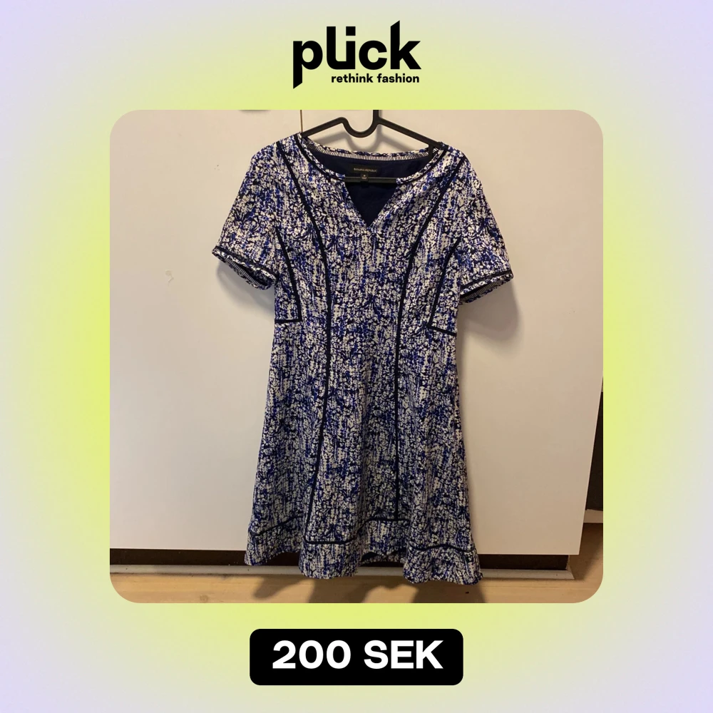 Säljer en superfin blå och vit klänning från Banana Republic. Den har ett unikt mönster och korta ärmar. Perfekt för både vardag och fest! Klänningen har en v-ringad hals och är i mycket bra skick.