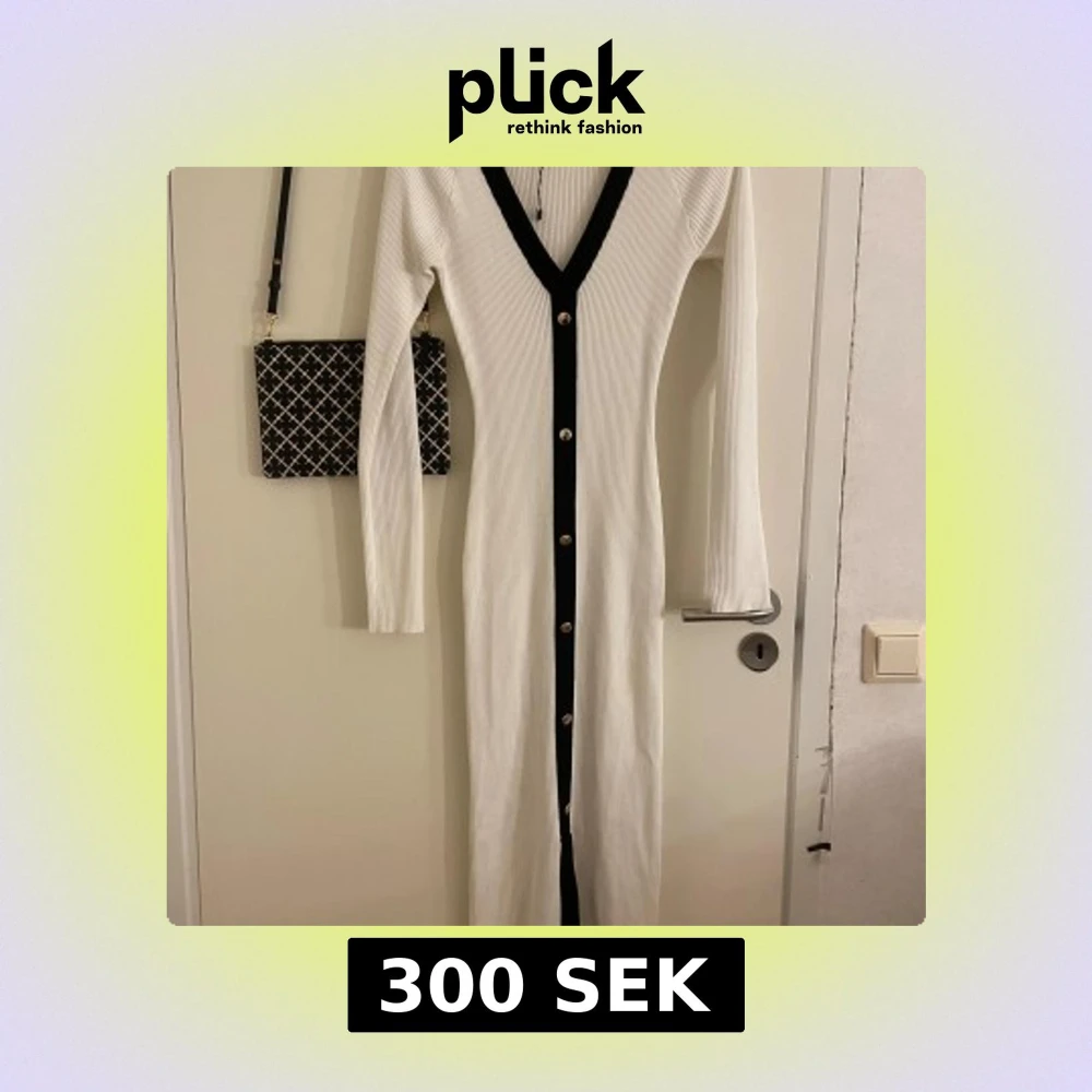 Snygg vit ribbad klänning från Missguided med svarta detaljer och knappar längs hela framsidan. Klänningen har en v-ringad design och långa ärmar, perfekt för en stilren look.