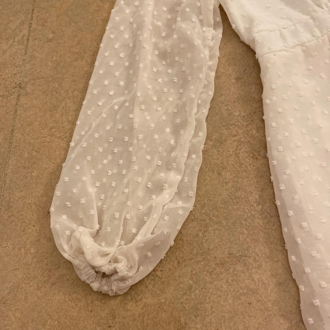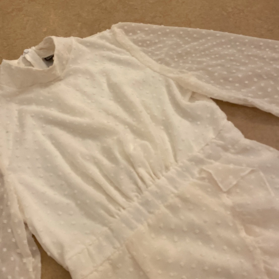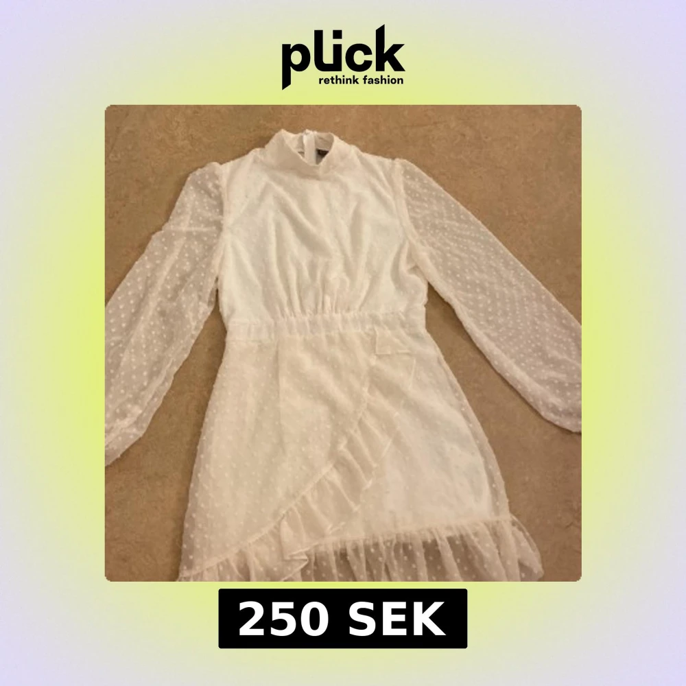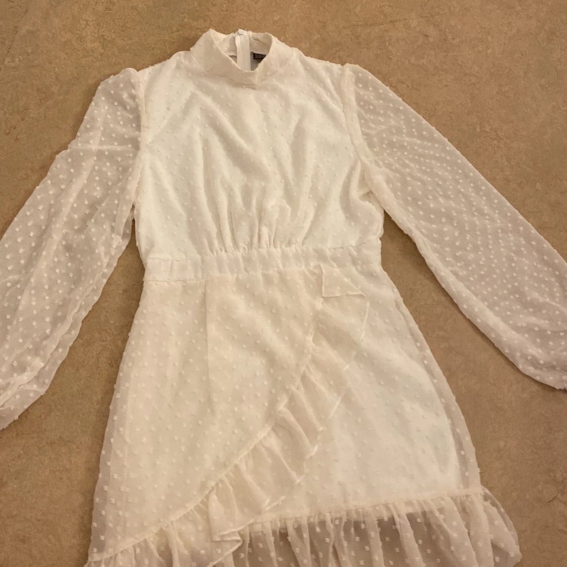 Charmig vit klänning med prickigt mönster och volangdetaljer. Har bara använt den 1 gång, passar för storlek xs och s! ❤️❤️🫶🏼