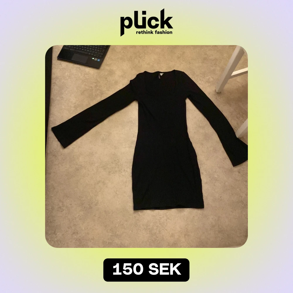 Snygg svart ribbad klänning från H&M Divided i storlek S. Den har en tight passform och långa ärmar, perfekt för både vardag och fest. Klänningen är i mycket bra skick och passar utmärkt till höst och vinter. Enkelt att styla med olika accessoarer!