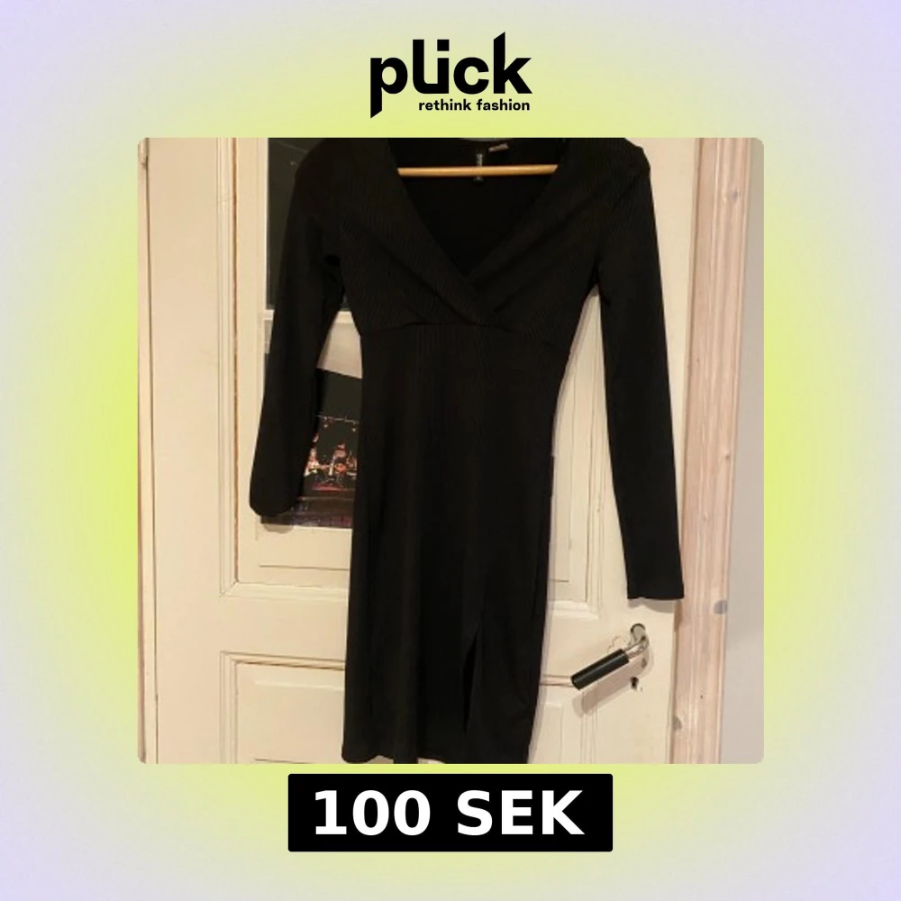 Snygg svart ribbad klänning med v-ringad hals och långa ärmar. Klänningen har en elegant slits framtill och omlott-design som ger en stilren look. Perfekt för både vardag och festliga tillfällen.
