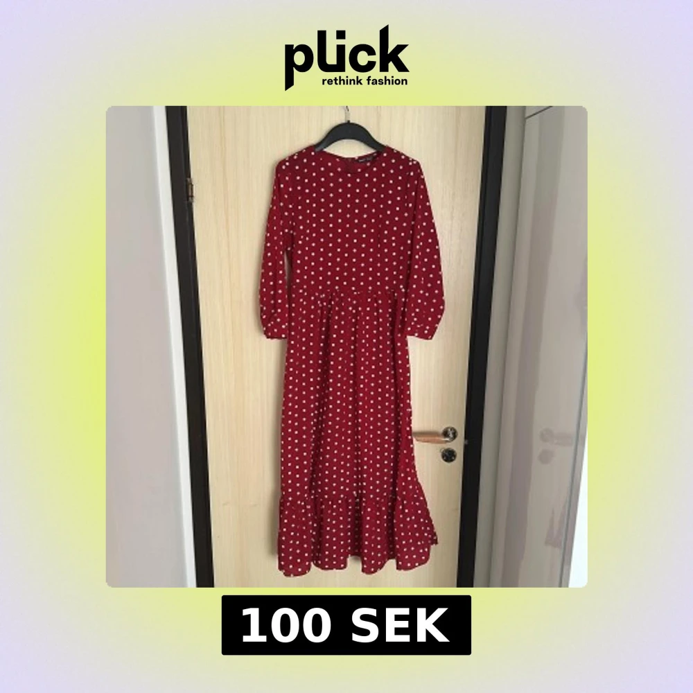 Säljer en röd långklänning från SHEIN med vita prickar. Klänningen har lång ärm, rund halsringning, dragkedja i ryggen och volang nertill. Perfekt för dig som gillar retrostil och vill sticka ut med ett lekfullt mönster.