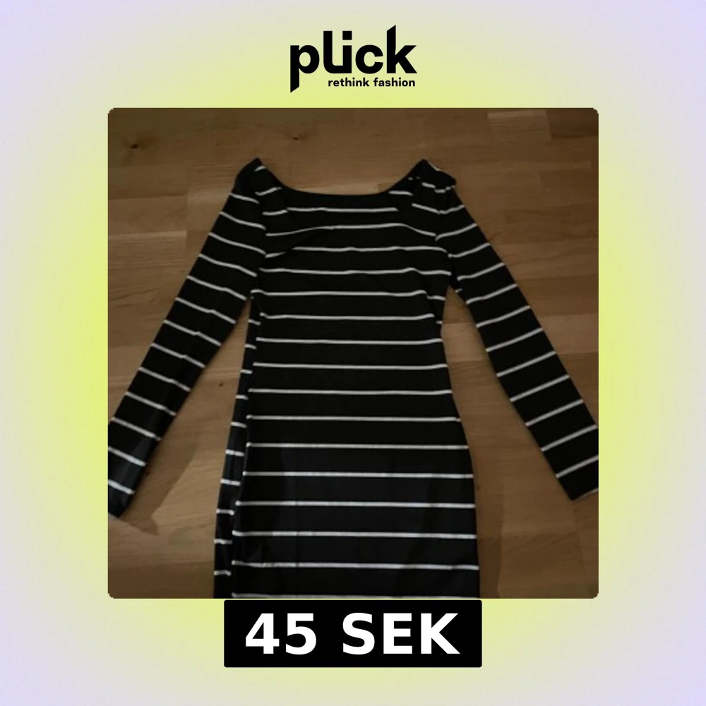Säljer en svart klänning med vita horisontella ränder från SHEIN. Klänningen har lång ärm och är tillverkad i mjuk polyester. Snygg och enkel design som passar perfekt till många tillfällen.