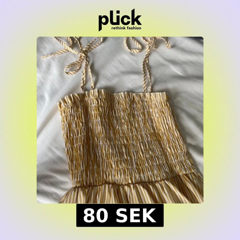Säljer en söt gul och vit randig klänning från SHEIN med smock upptill och knytbara axelband. Klänningen har en luftig passform och är perfekt för varma dagar. Längden är mittilång och materialet känns lätt och somrigt.