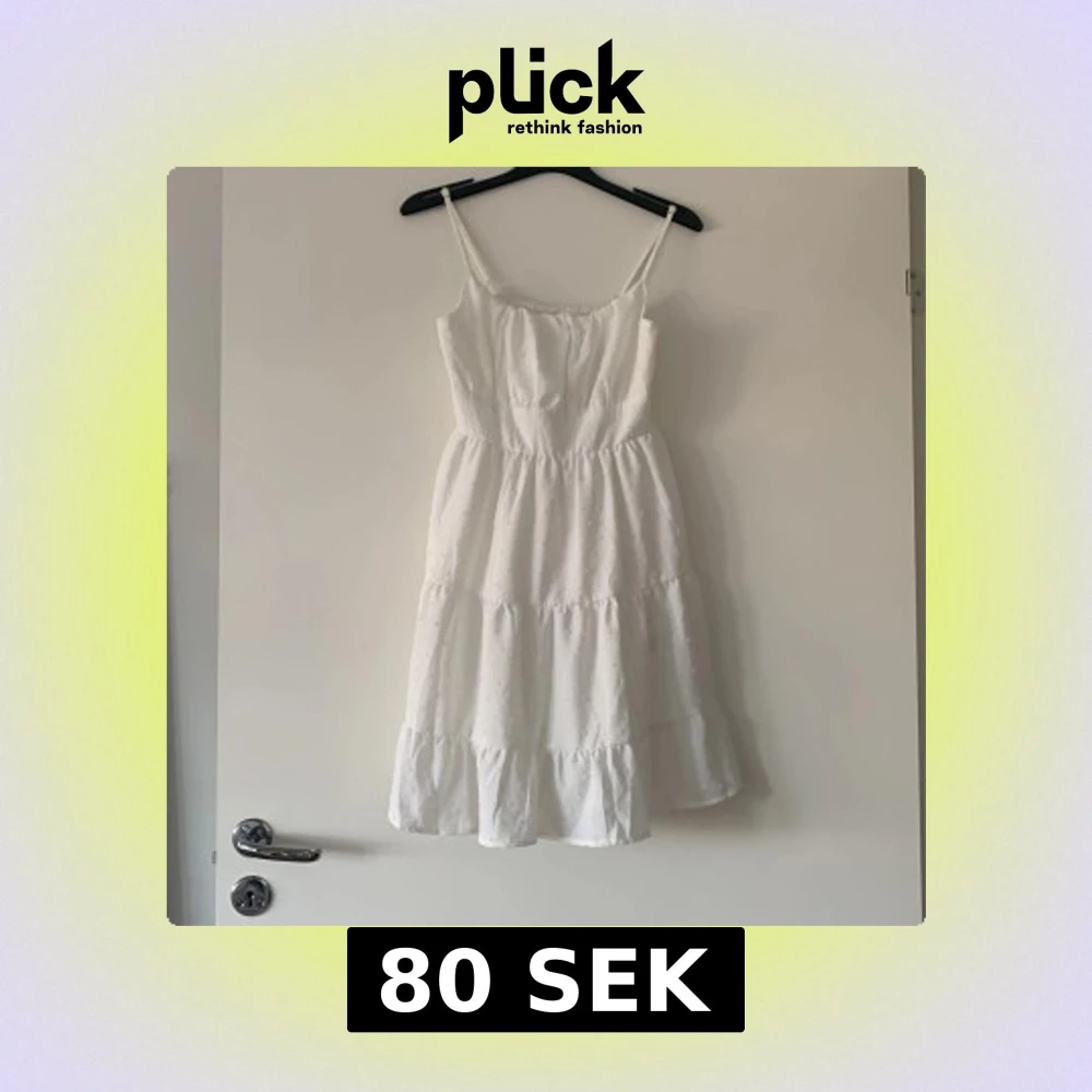 Söt vit klänning från Shein med smala axelband och ett lätt rynkat liv. Klänningen har en luftig passform och är perfekt för varma dagar. Den har ett diskret prickigt mönster och är tillverkad i polyester.