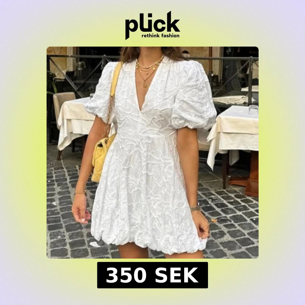 Vit klänning med v-ringning och puffiga kortärmar. Perfekt inför sommaren och studenten. Tyvärr passade den inte mig och behöver därför sälja den. Nypris var 549 kr och klänningen är helt oanvänd. Pris kan diskuteras vid snabb affär.Säljer samma klänning i M i en annan annons ifall S är för litet.