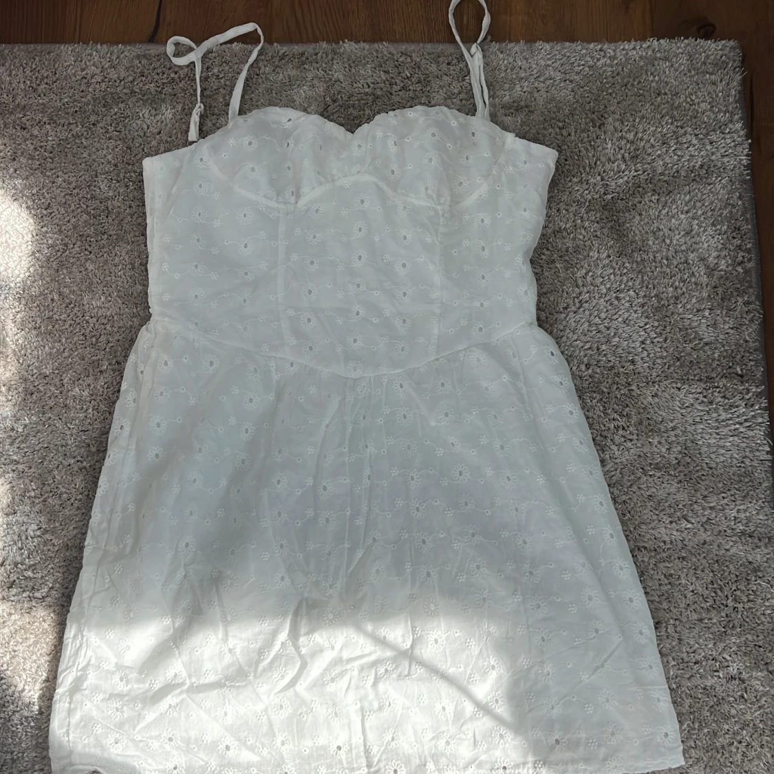Charmig vit klänning med smala axelband och spetsdetaljer. Den har en figurnära överdel och en luftig kjol som ger en romantisk känsla. Perfekt för varma sommardagar och studenten! Klänningen är helt oanvänd! (Lånad bild från hemsidan som klänningen är beställd ifrån) #studentklänning #vit #kortklänning #utspringsklänning
