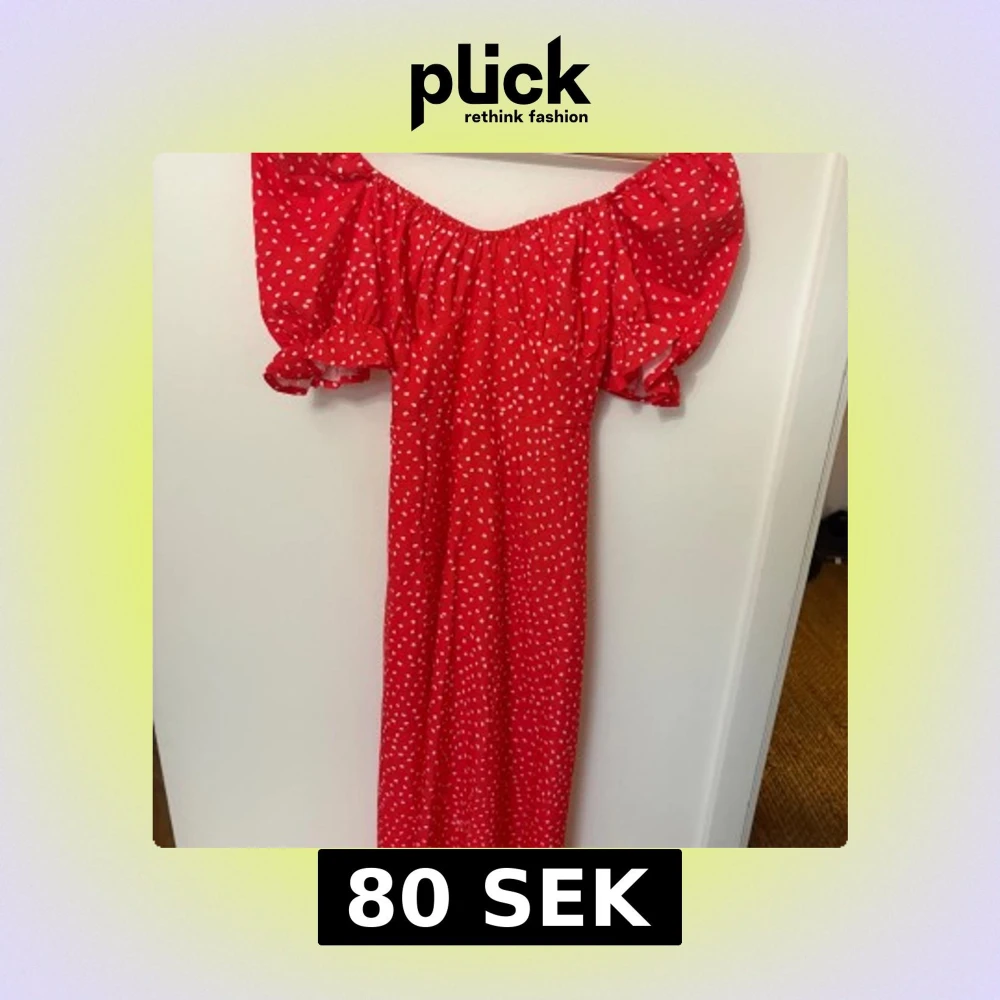 Superfin röd klänning med vita prickar och puffiga korta ärmar. Klänningen har resår vid axlarna och ett knytband i midjan för extra passform. Perfekt för sommarens alla tillfällen!