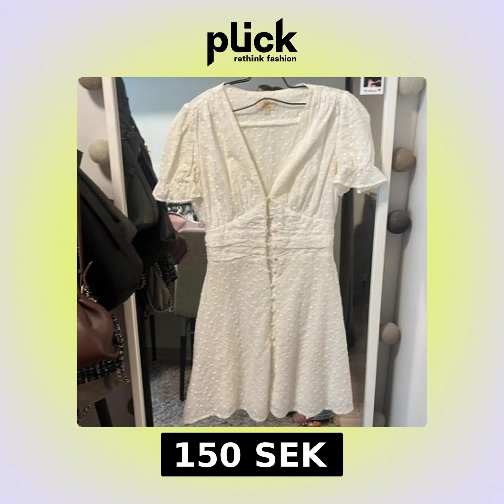 Supersöt vit kortklänning från Chelsea med små broderade blommor, v-ringning och knappar framtill. Puffiga kortärmar och markerad midja ger en romantisk känsla. Perfekt för sommarens alla tillfällen!