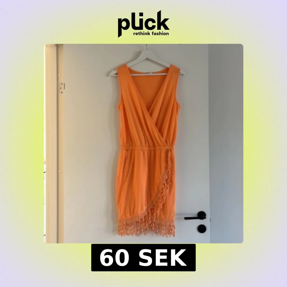 Snygg orange ärmlös klänning med omlott-design och fransdetaljer längs fållen. Perfekt för sommarens fester. Klänningen har en elastisk midja för en bekväm passform.