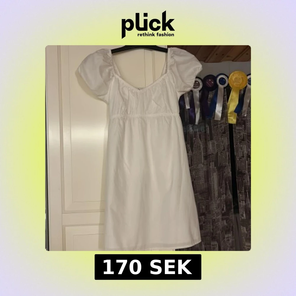 Supersöt vit klänning med puffiga kortärmar och smockad rygg. Den är perfekt till avslutningen me även till annat den är använd en gång priset kan diskuteras💗💗