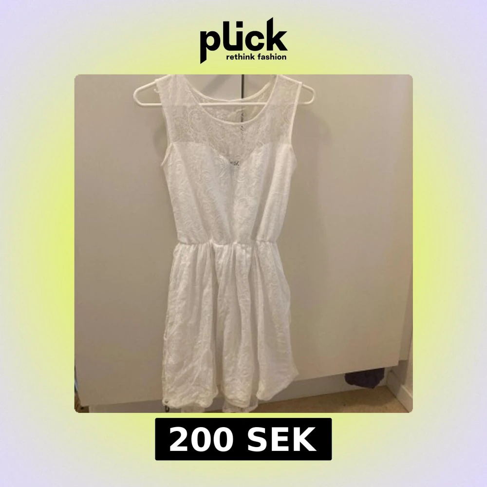 Säljer en söt vit spetsklänning från Dry Lake i storlek XS. Klänningen har ett vackert spetsmönster och är ärmlös med en rund halsringning. Perfekt till student eller skolavslutning