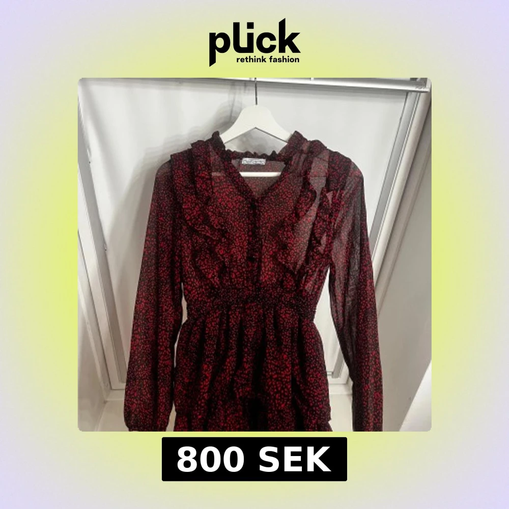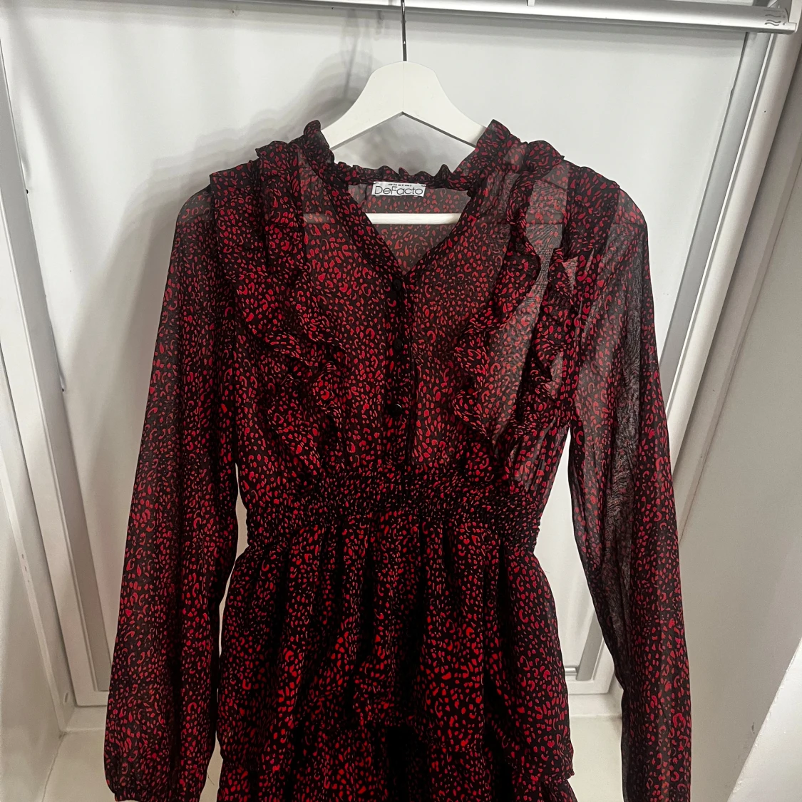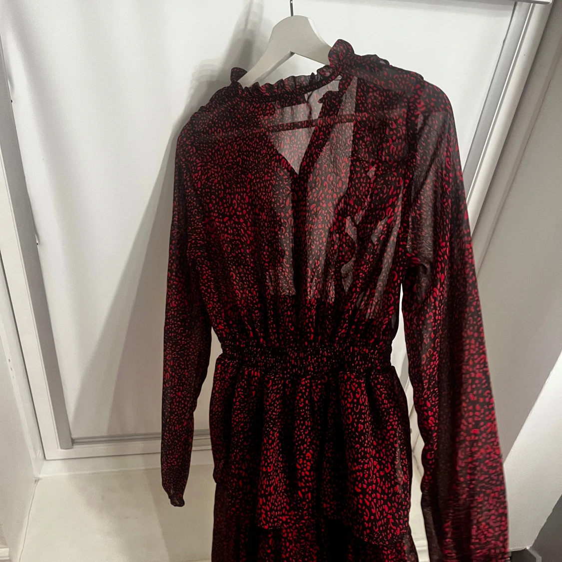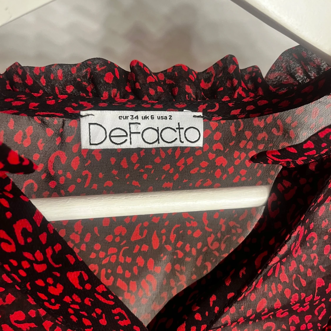 Säljer en svart klänning med röda leopardmönster från DeFacto. Klänningen har långa ärmar, volangdetaljer vid halsringningen och midjan är markerad med resår. Perfekt för dig som gillar djurmönster och vill sticka ut. Orginal pris 1300 har jag för mig! Pris går att diskutera❤️❤️