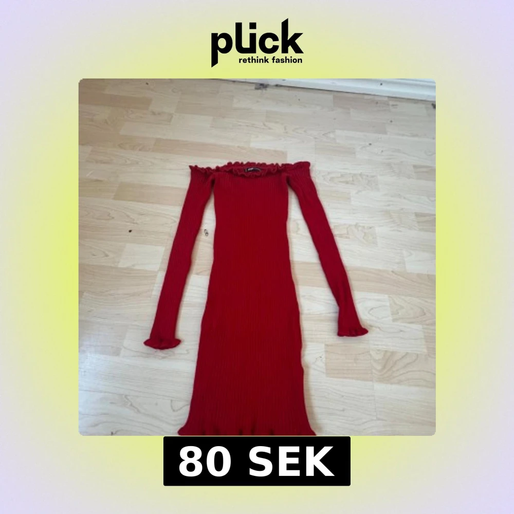 Snygg röd ribbad klänning från FB Sister med offshoulder-design och långa ärmar. Perfekt för att sticka ut med sin livfulla färg och stiliga passform. Klänningen har en volangdetalj vid halsen som ger en extra touch av elegans.