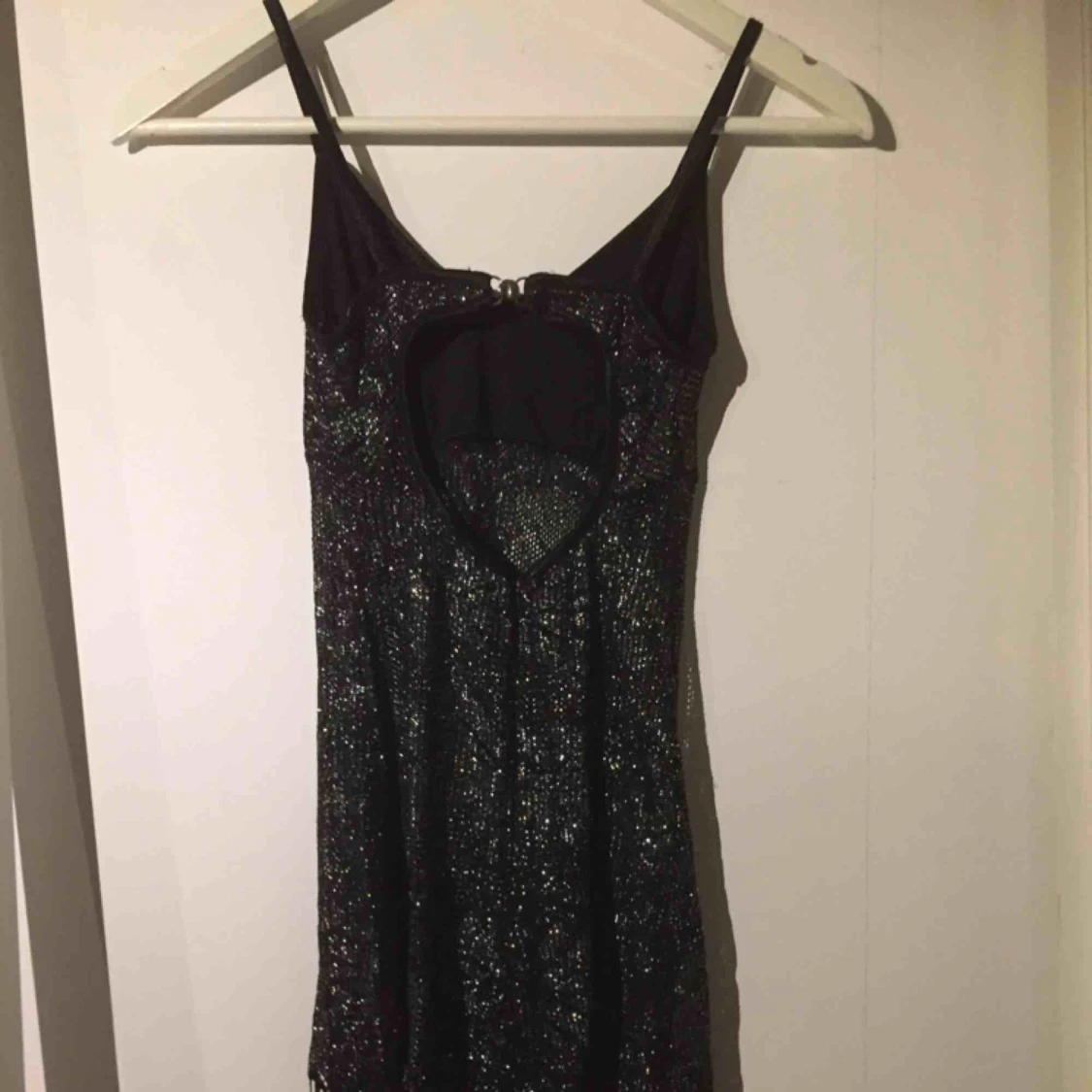 Jättefin klänning i genomskinligt svart/silver metallic textil. Inte en klänning man har på sig till skolan eller jobbet.... Fransar nertill och fin rygg. Står S, men mera mot xxs/xs. Mycket kort, ca 75 cm inkl fransar.
