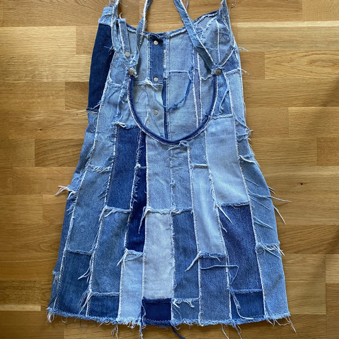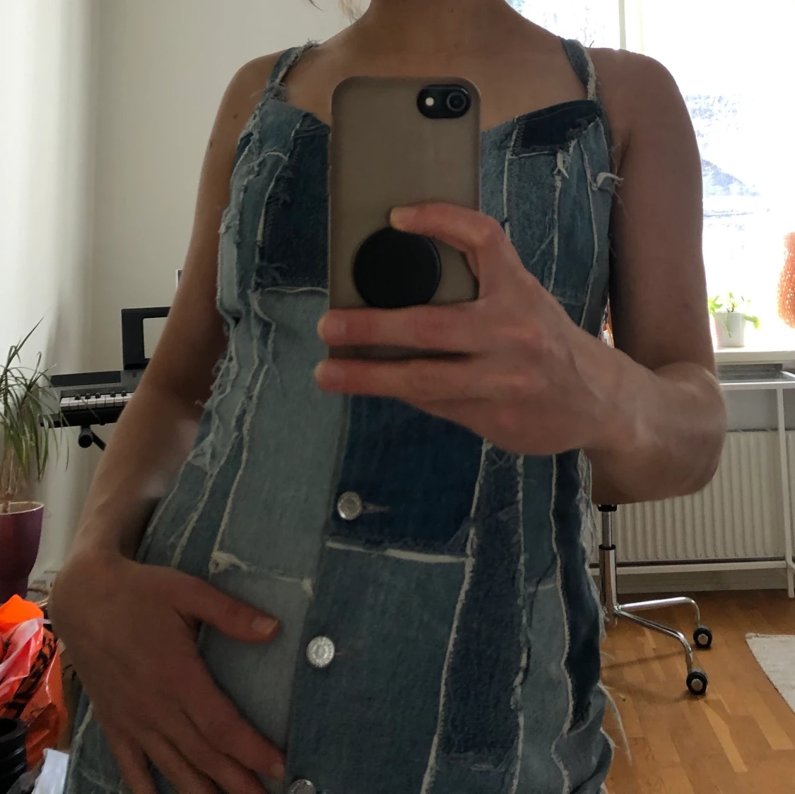 Kort jeansklänning i storlek 36. Supercool! Skickat fler bilder man vill se. Öppen i ryggen. Kort! Jag är 169 och den går precis över rumpan på mig.