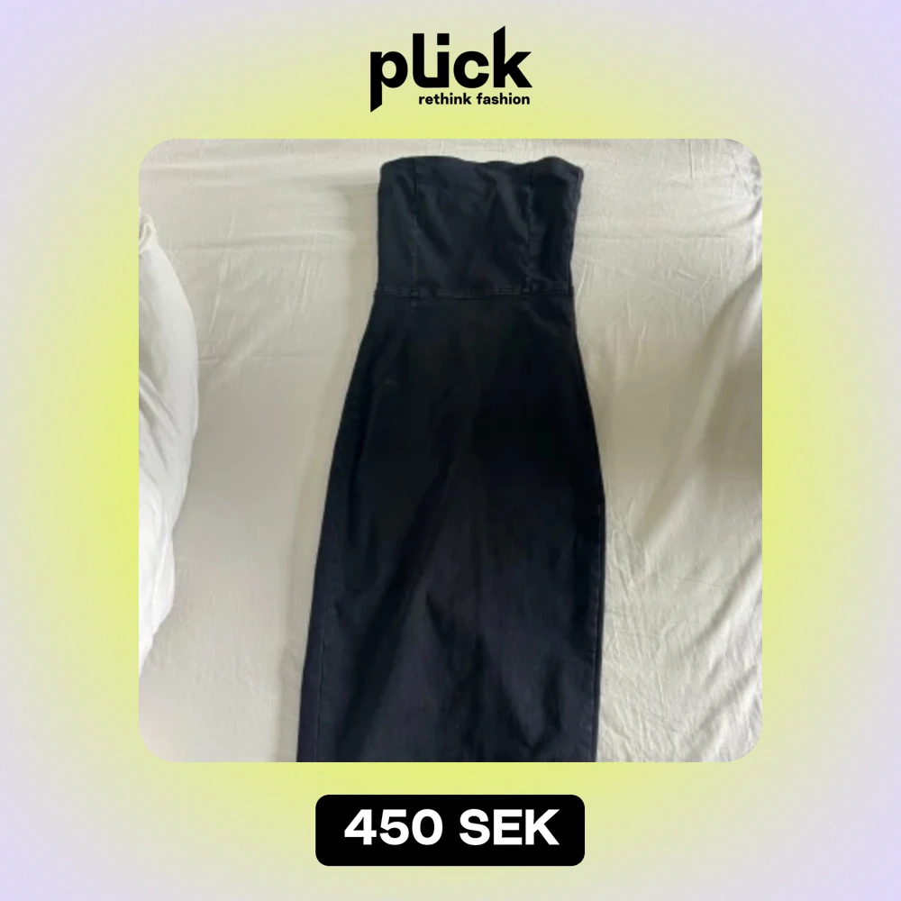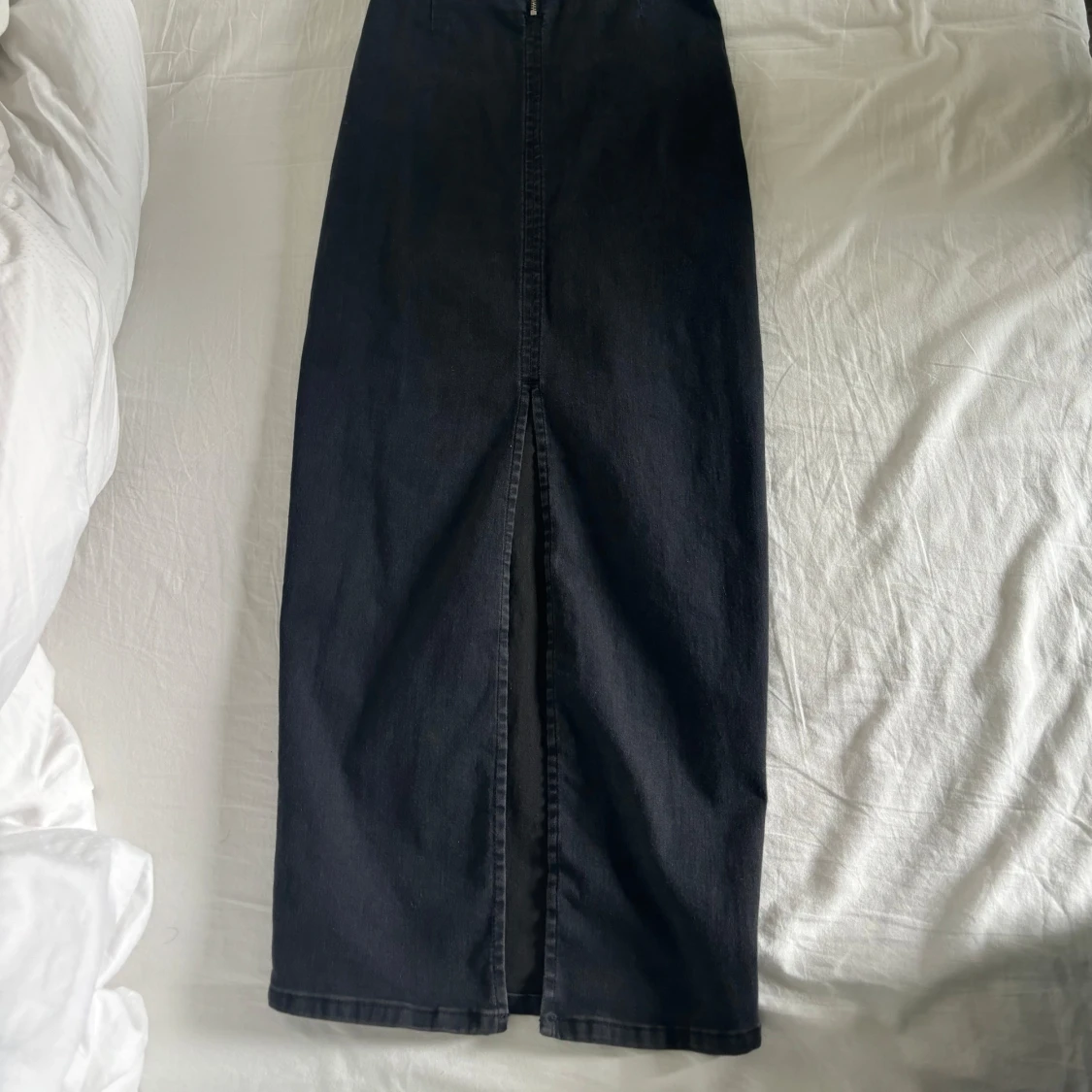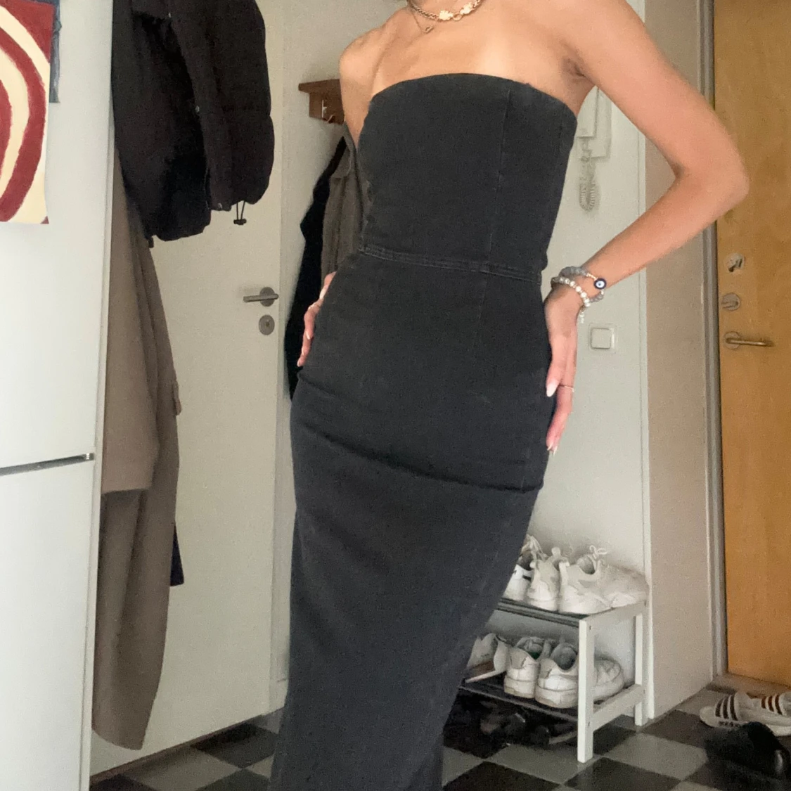 Super fin denim klänning i mörkgrått med en slit på baksidan. Den är i storlek S och använd en gång! Tyvärr är den lite för kort på mig för min smak! Jag är 180,5cm lång för referens!