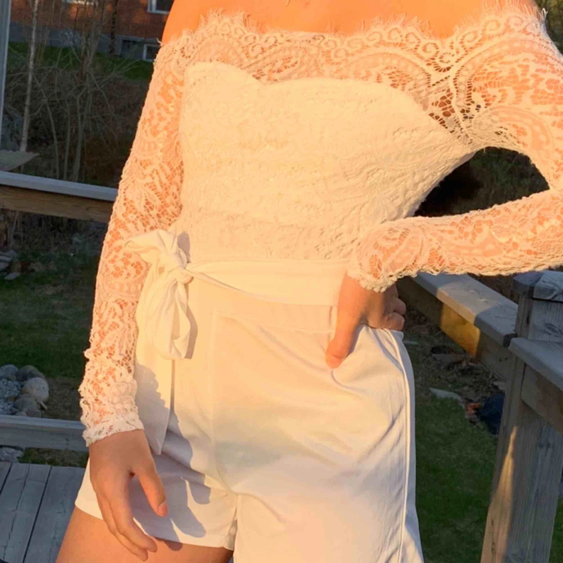 SĂ„ vacker jumpsuitđ MĂ€rket Dennis MagliÄđ Storlek M men liten i storlek sĂ„ sitter med som S. Endast anvĂ€nd en gĂ„ng sĂ„ i princip som ny!! vit, spets och har ett snöre i mitten dĂ€r man kan vĂ€lja att ha en rosett bĂ„de fram eller bak!