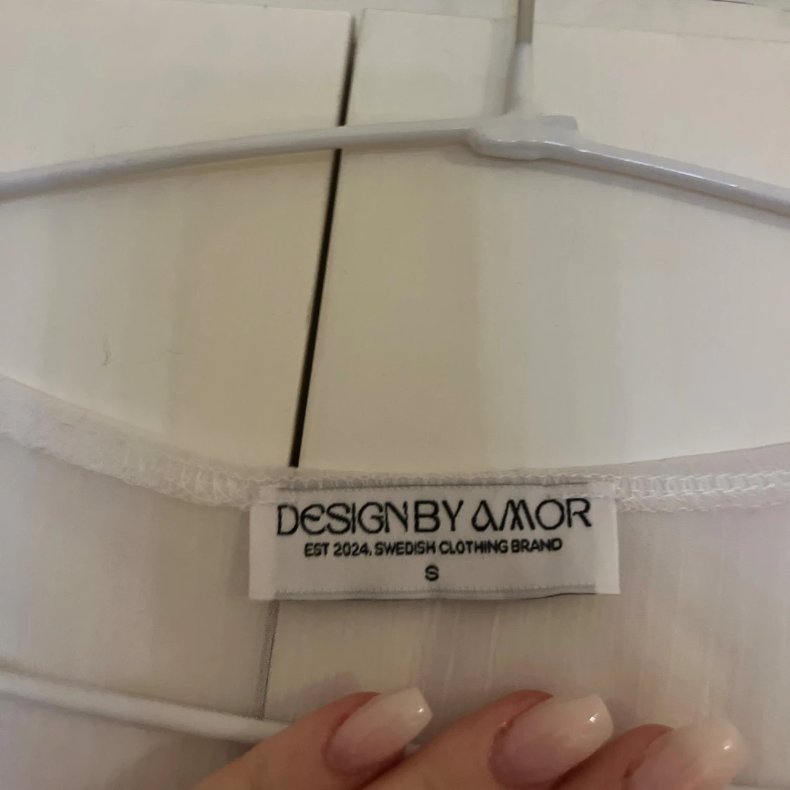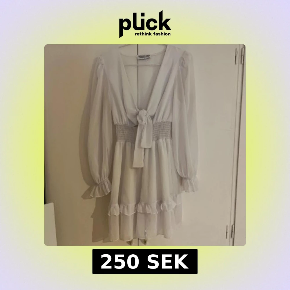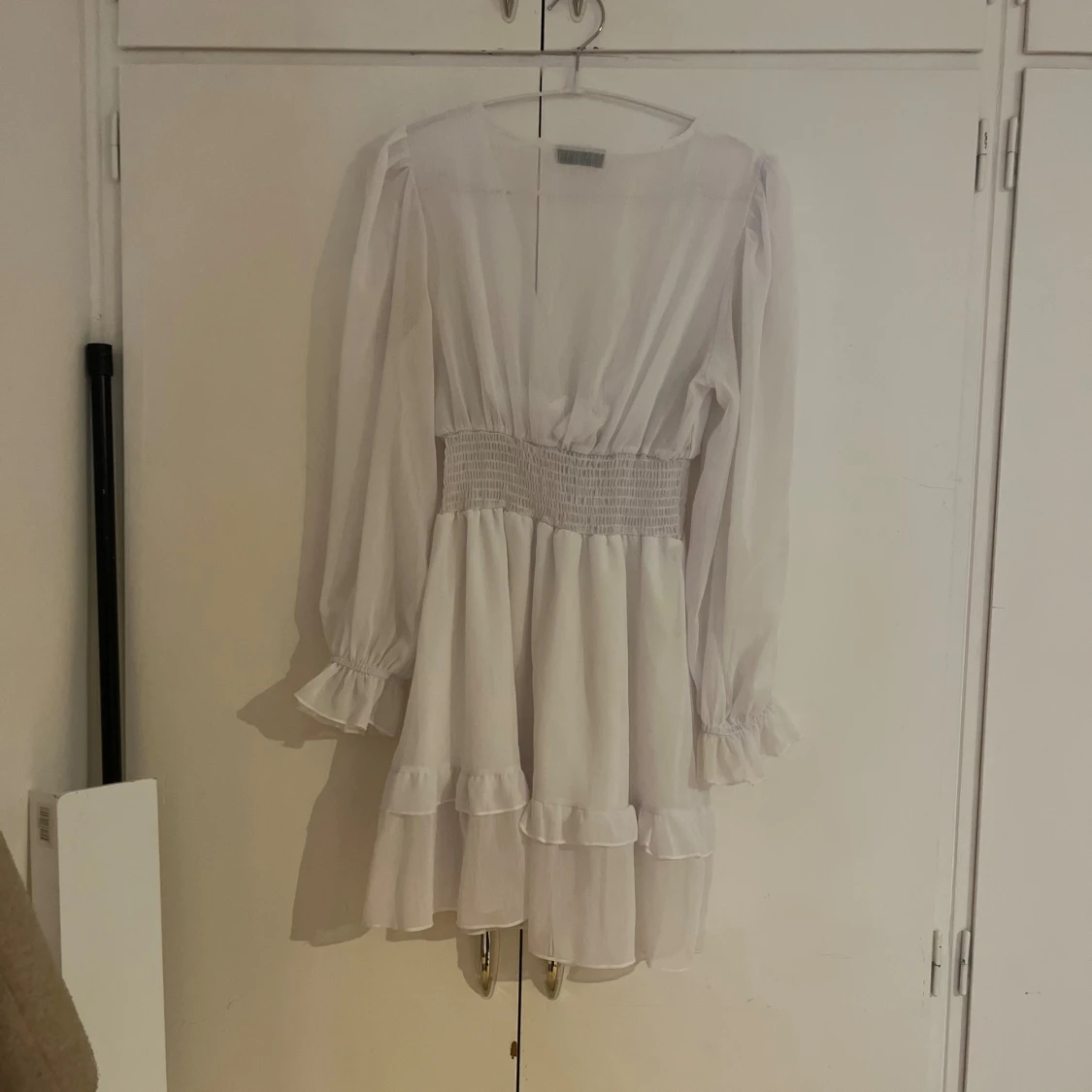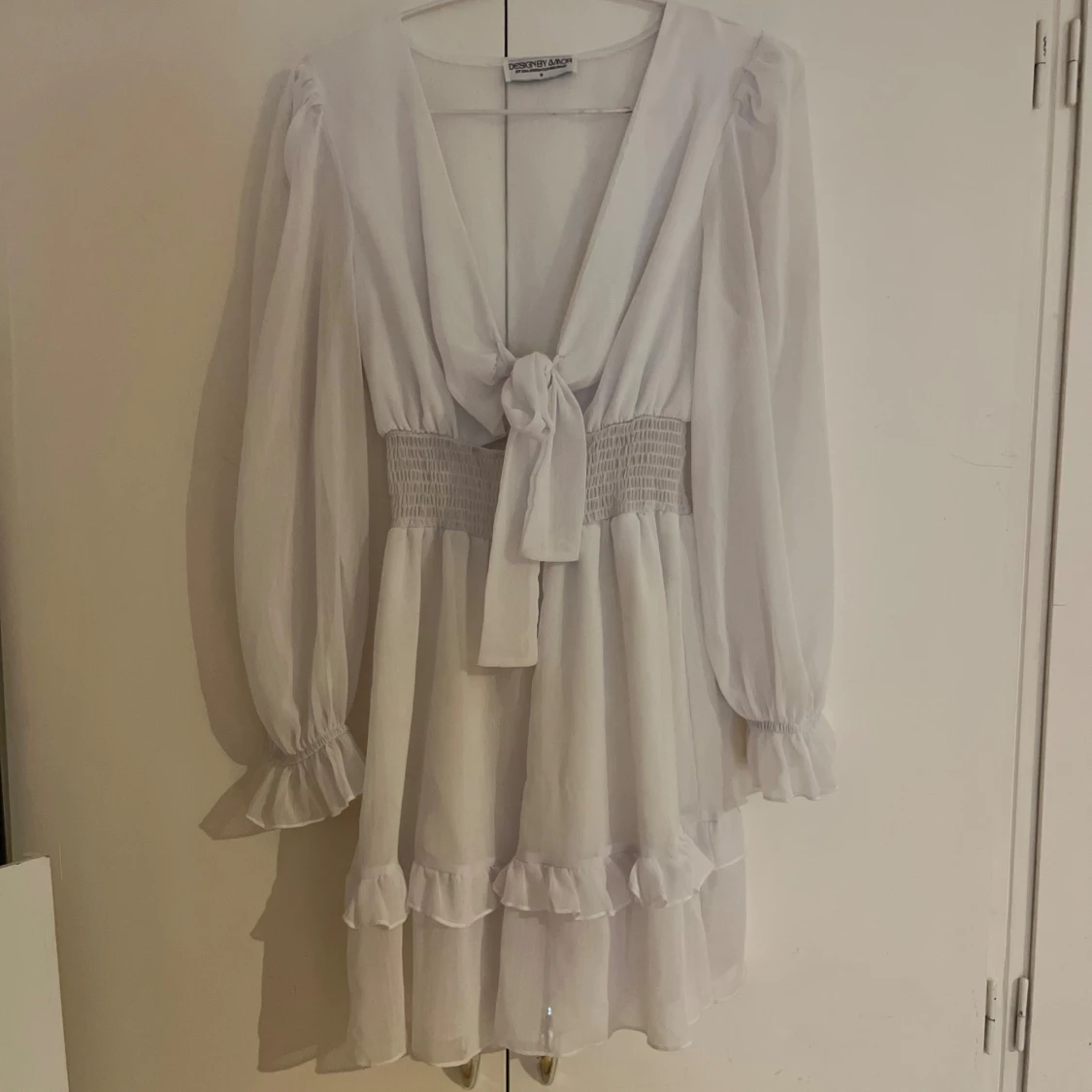 Supersöt vit kortklänning från Design By Amor med volangdetaljer och smock i midjan. Klänningen har långärmade transparenta ärmar, v-ringning med knyt framtill och volanger längst ner. Perfekt för dig som gillar romantisk och feminin stil.