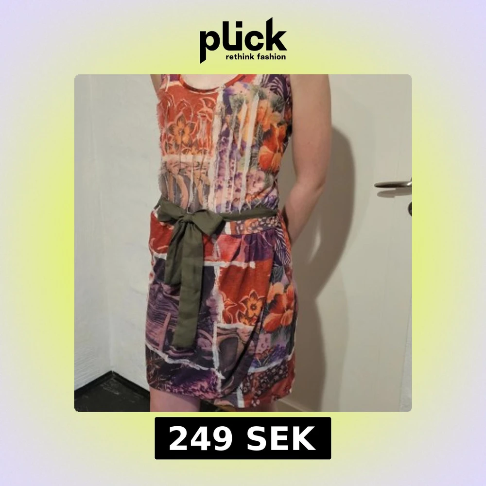 Säljer en unik och färgglad kortklänning från Desigual med blommigt och konstnärligt mönster i rött, lila och orange. Klänningen är ärmlös och har ett grönt knytbälte i midjan samt meshdetaljer upptill. Perfekt för dig som vill sticka ut!