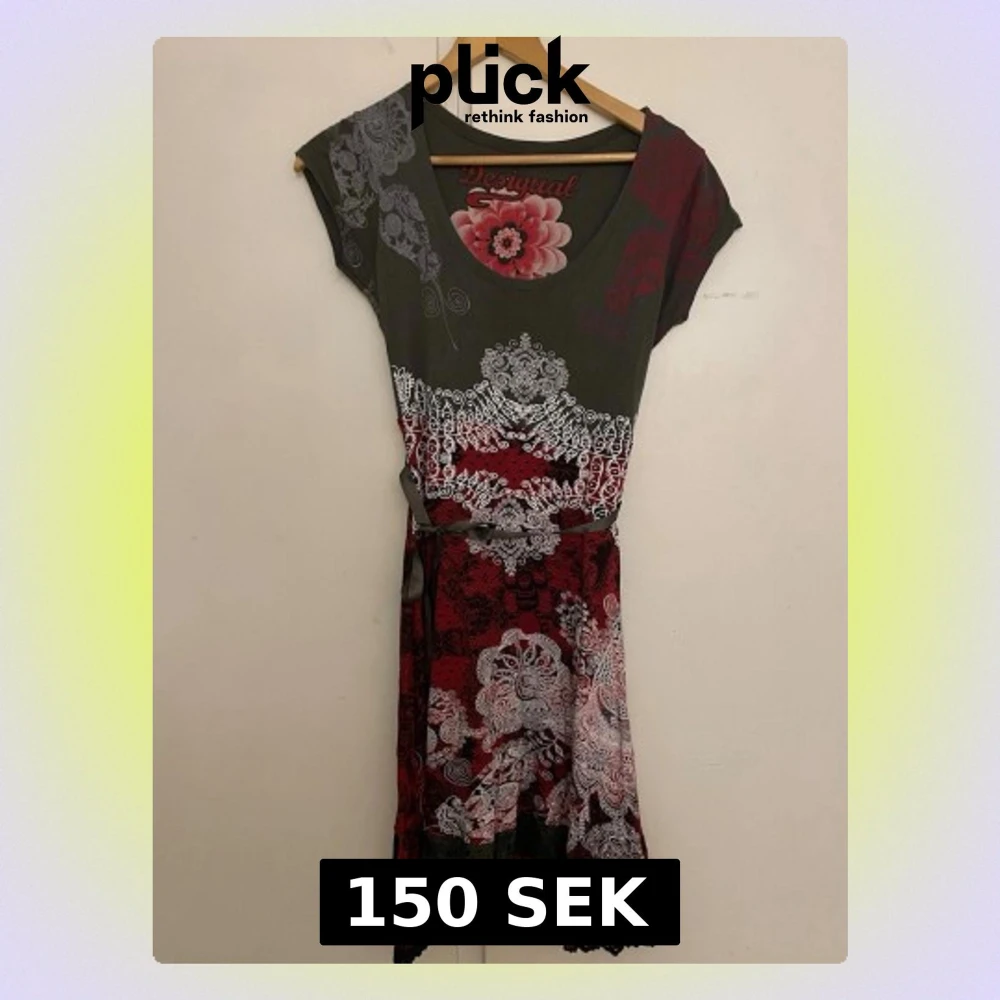 Unik klänning från Desigual med kort ärm, rund halsringning och bälte i midjan. Klänningen har ett färgstarkt mönster i rött, svart, grått och vitt med blommiga detaljer och spetskant nertill. Perfekt för dig som gillar statement-plagg och kreativ design.