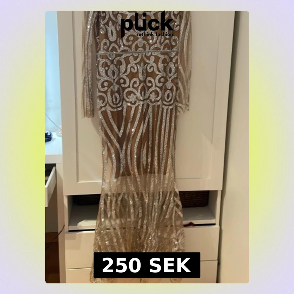 Säljer en lång transparent klänning med glittrigt silvermönster och långa ärmar. Klänningen har en nude/beige bas och är täckt av dekorativa, glittriga detaljer som ger en riktigt festlig look. Perfekt för dig som vill sticka ut med stil.