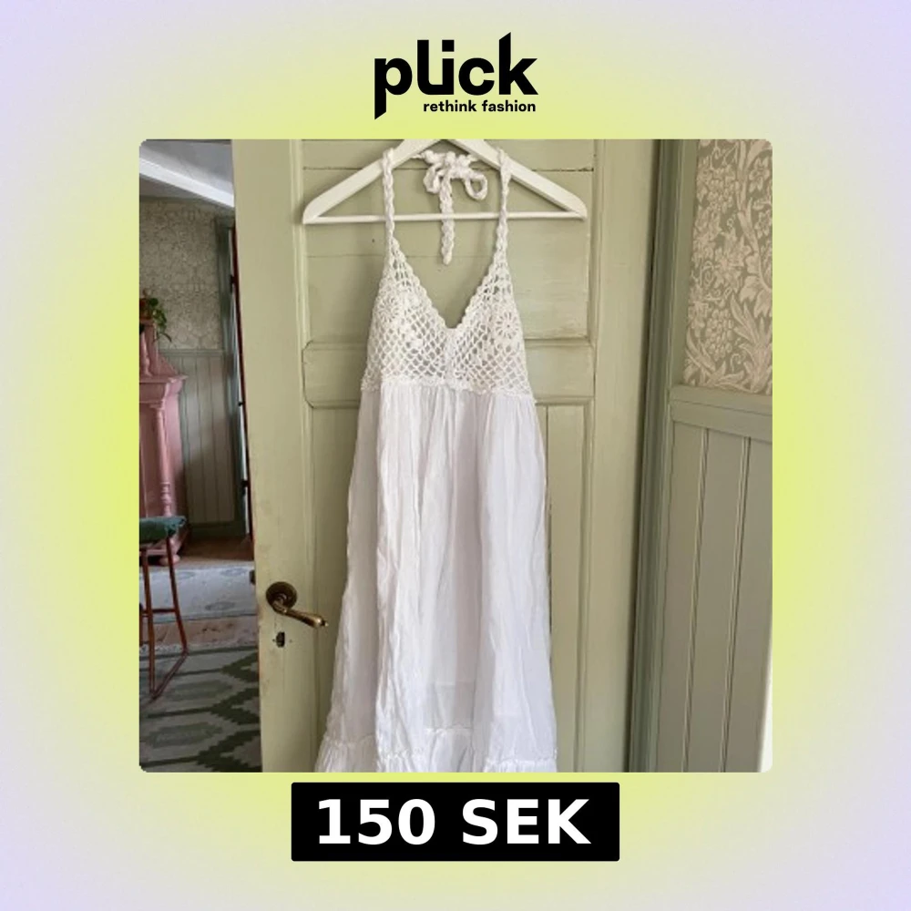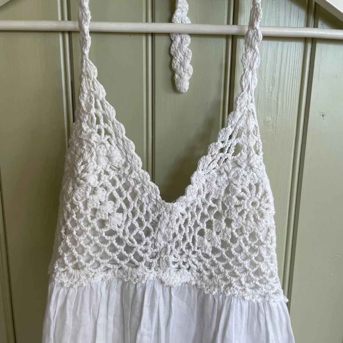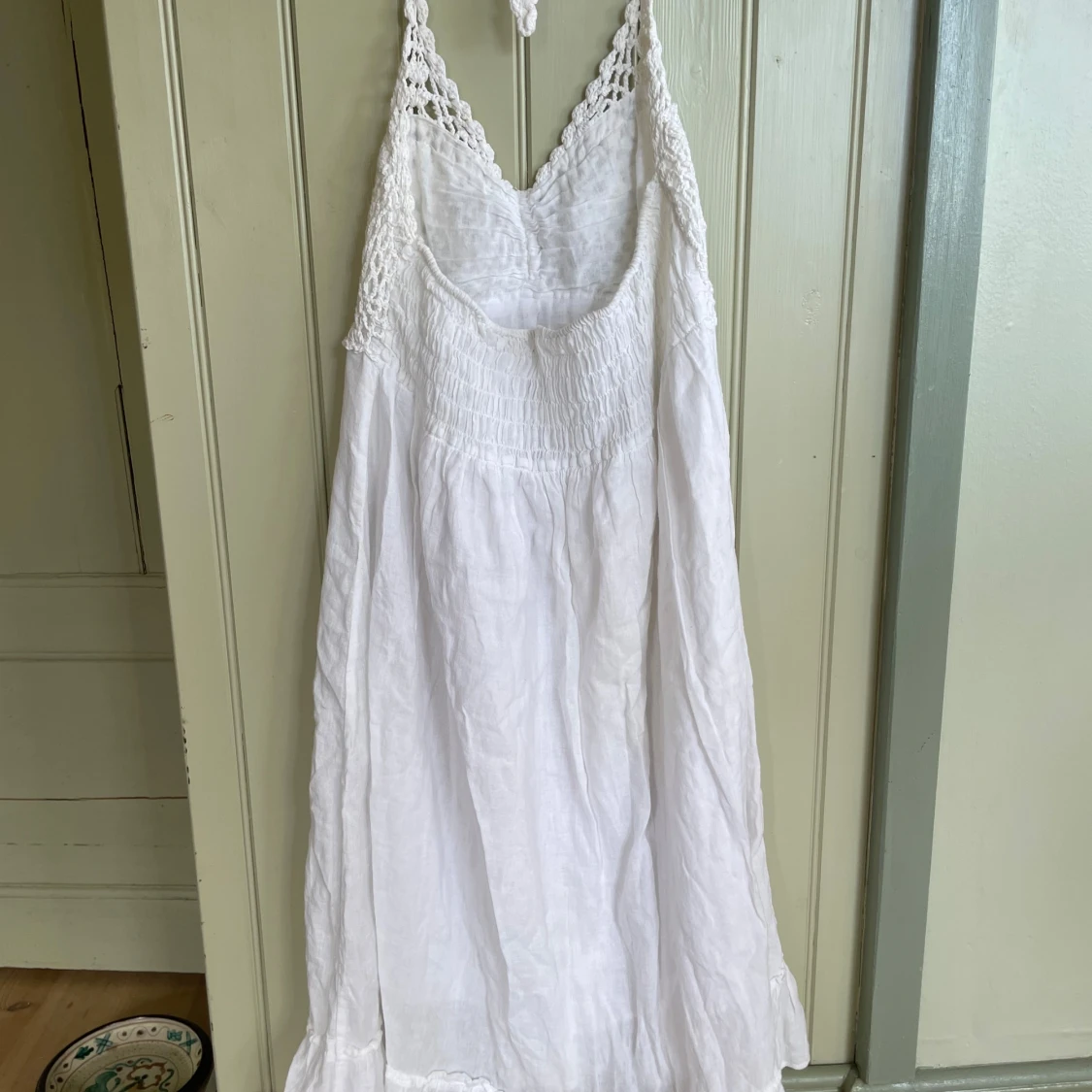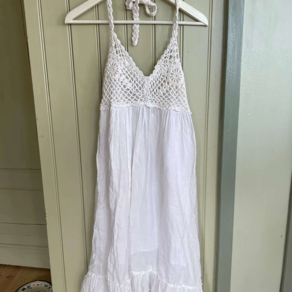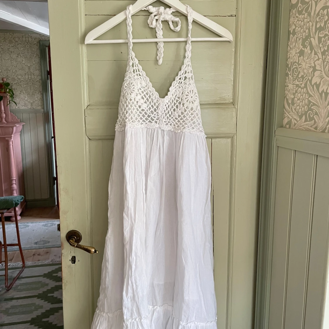 Superfin vit klänning med virkad överdel och knytband i nacken. Kjolen är luftig och faller lätt, perfekt för varma dagar. Klänningen har en bohemisk känsla och är ärmlös med en lätt rynkad nederdel.