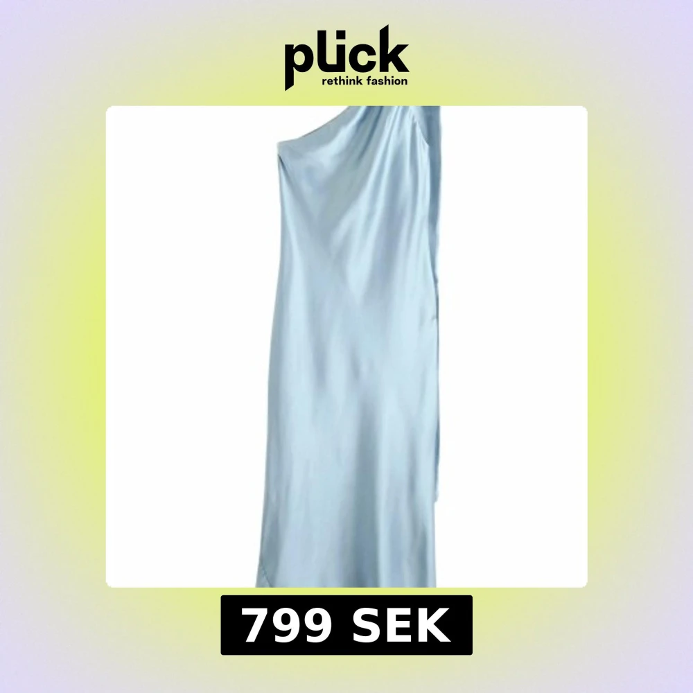 Elegant satinklänning enaxlad med sjal över axeln. Använd en gång i mycket fint skick endast några slitningar på sjalen som inte syns när man slänger över den på axeln och några få slitningar på klänningen som inte är så märkvärdiga. Behöver endast ångstrykas. Sjalen är avtagbar.