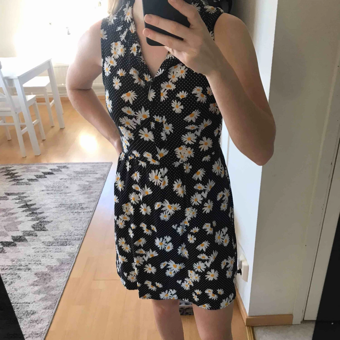 Söt blommig klänning med krage och en liten öppning i ryggen. Den har använts lite och är i fint skick!