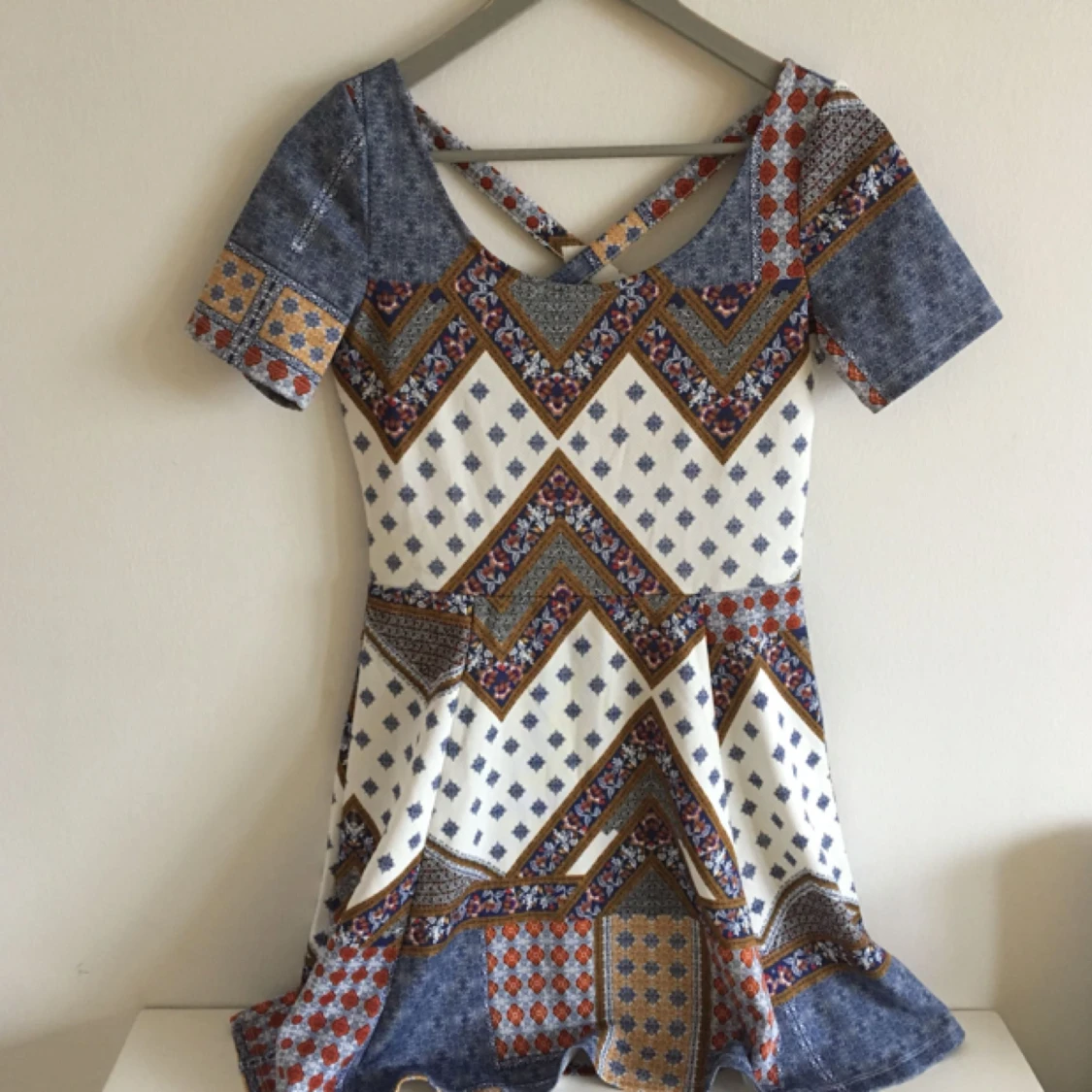Multimönstrad klänning i stretchigt hyfsat tjockt material. Jättefin i ryggen dessutom!