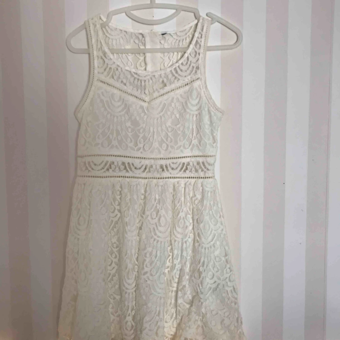 Mycket fin vit mönstrad klänning i bra skick. Endast använd en gång! Bekväm med dragkedja som går långt ner i bak. Superfint mönster som skulle passa perfekt på studentdagen. :) Betalning sker via swish!