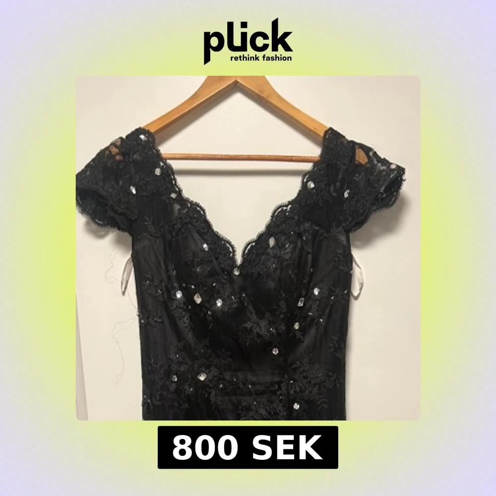 Säljer en svart långklänning med v-ringad hals och korta spetsärmar. 💕Klänningen är i spets med paljettstenar över hela tyget. Passformen är slim och materialet känns lyxigt, perfekt för bal eller fest. Pris går att diskutera💗