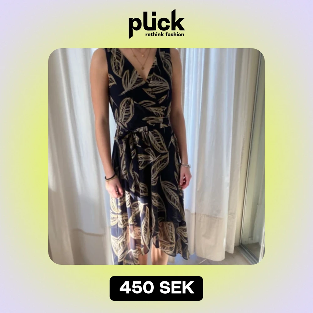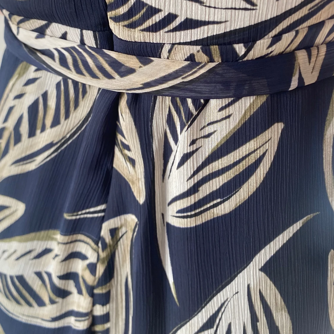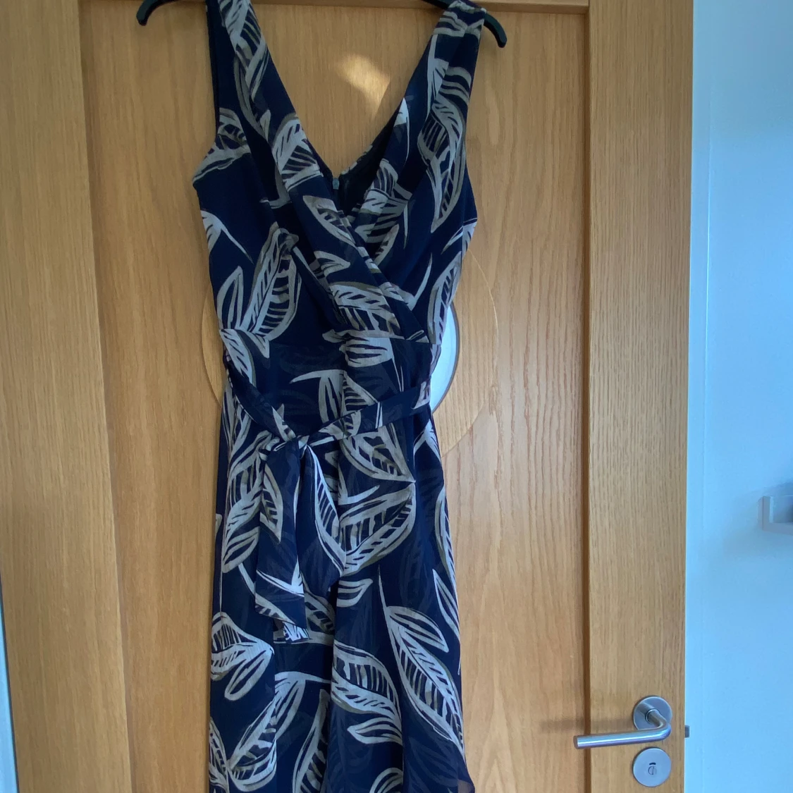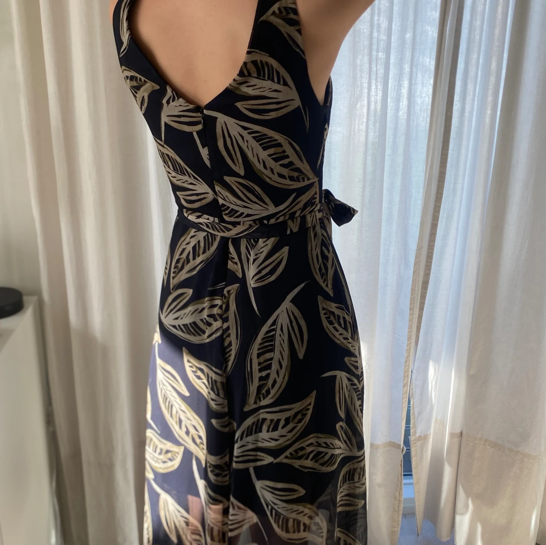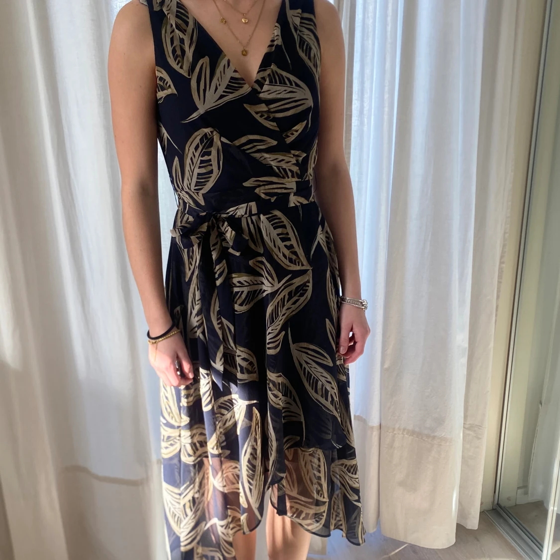 Fin blommig mörkblå sommarklänning med skärp i midjan, v-ringad fram och blixtlås bak, stl S, från DKNY.