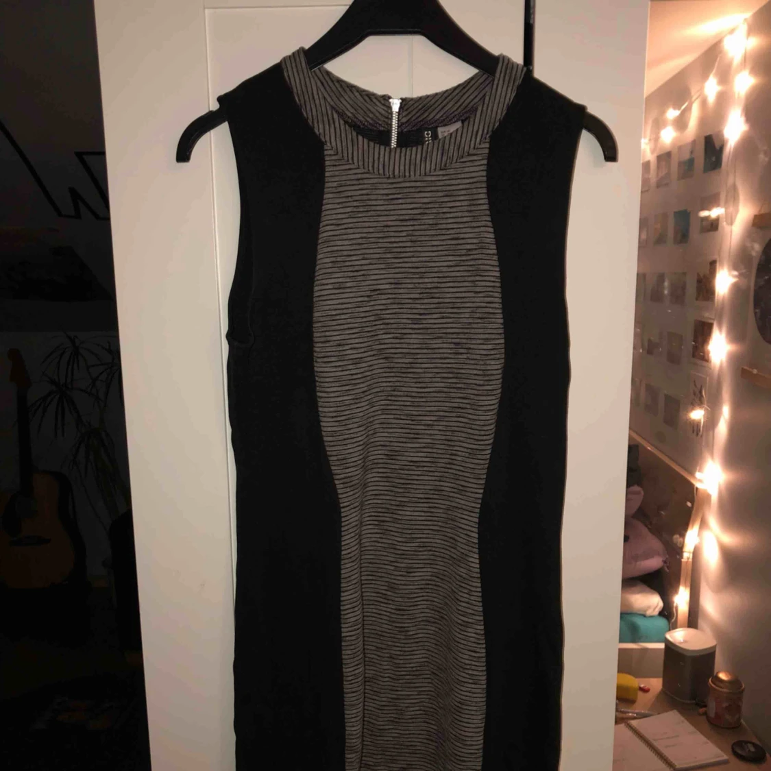 Grå och svart klänning. Sitter snygg och ger en snygg form. Köparen står för frakt, kan mötas upp i Lund
