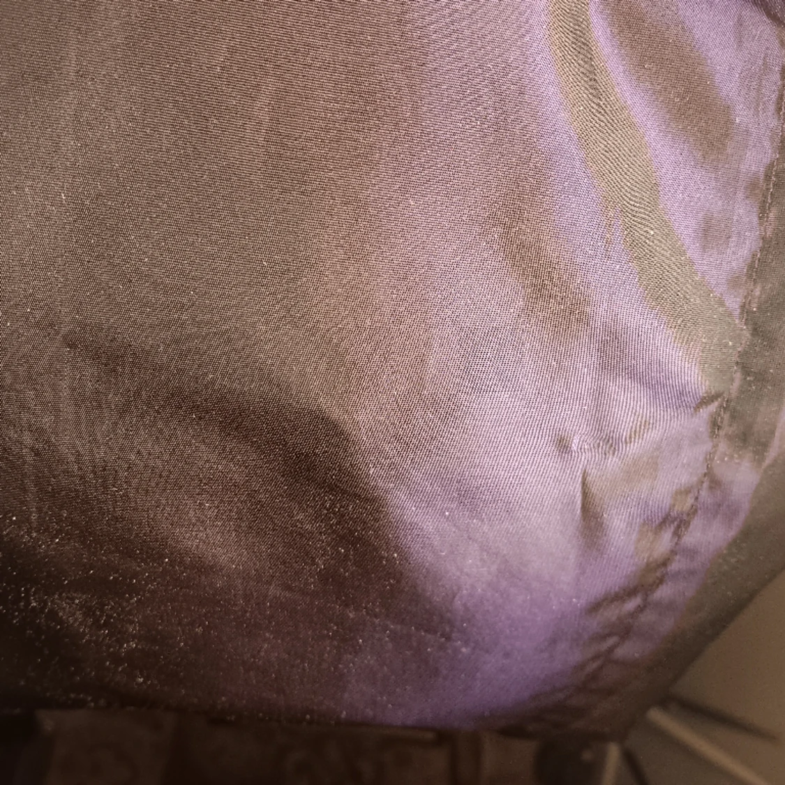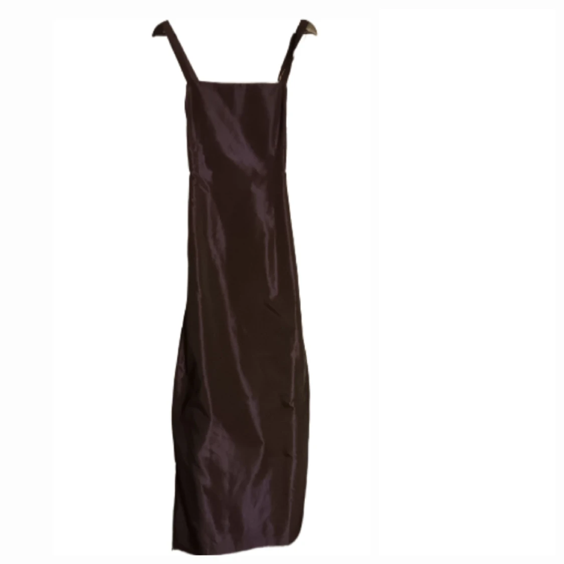 Lila klänning i "plastigare" tyg, typ som utklädningsdräkter brukar vara på utsidan och sidenliknande på insidan. Köpt second hand av mig men passar tyvärr inte. Korsande band, lila/svart färg, når mig till knäna (175 cm)
