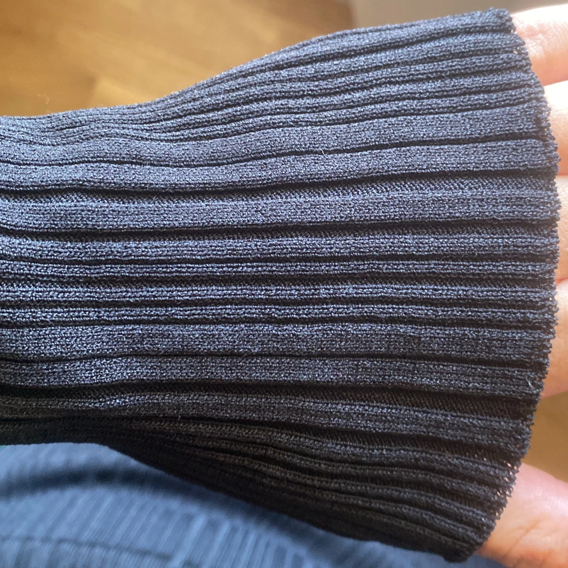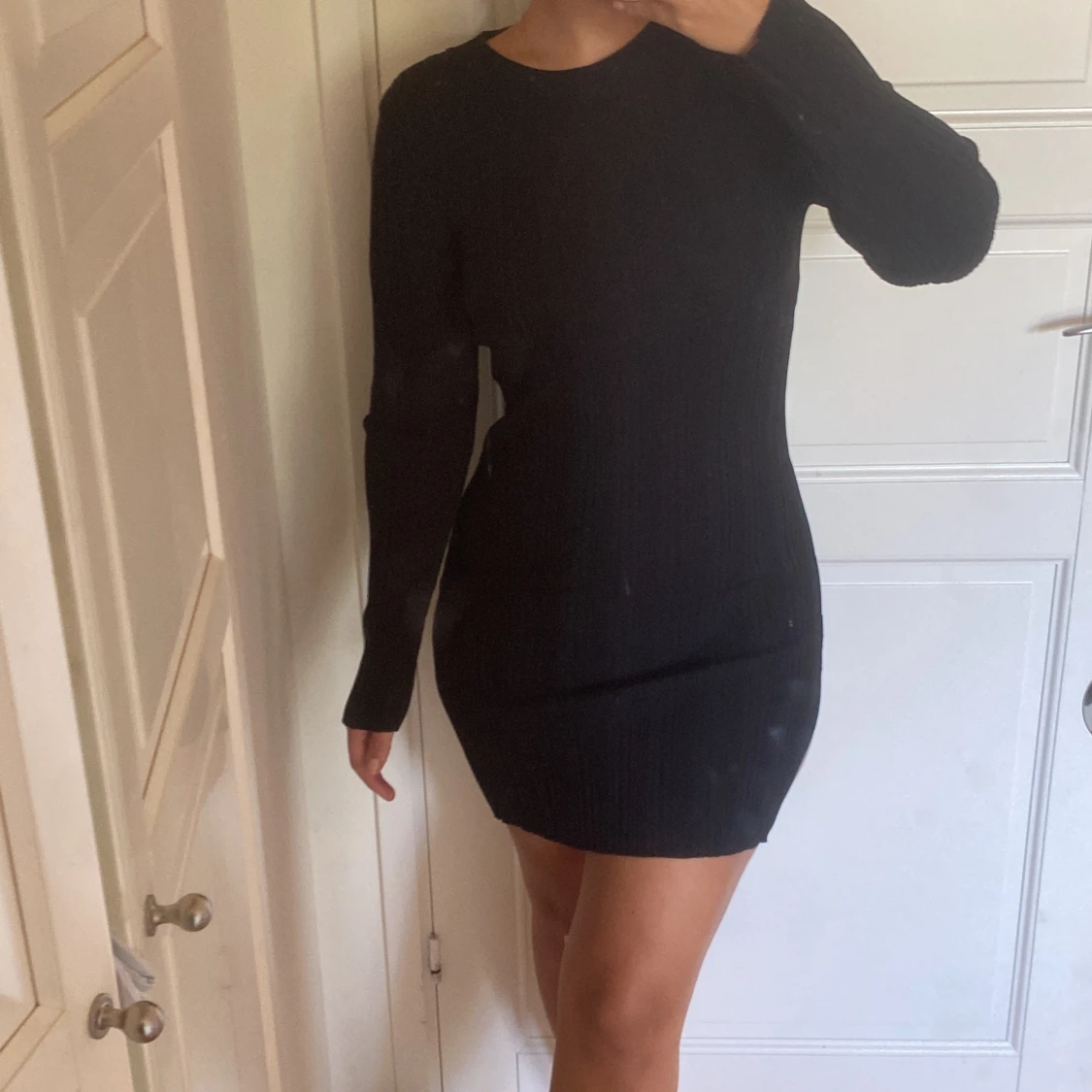 Svart ribbstickad klänning från Gina tricot. Storlek S men materialet är väldigt stretchigt och passar XS-M. Ganska kort men funkar bra på mig som är 165. Slits längst ner på båda sidor. Väldigt bra skick
