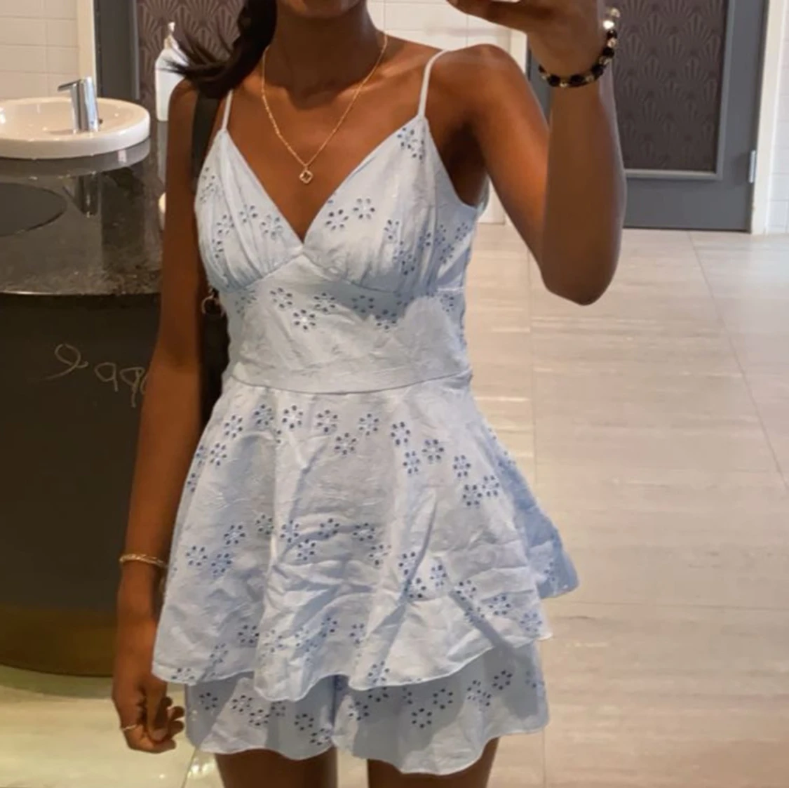 Jätte fin blommig klänning med inbyggda shorts, kommer tyvär inte till användning, nyligen köpt. Hör av er vid frågor!