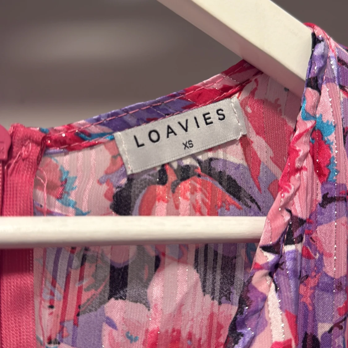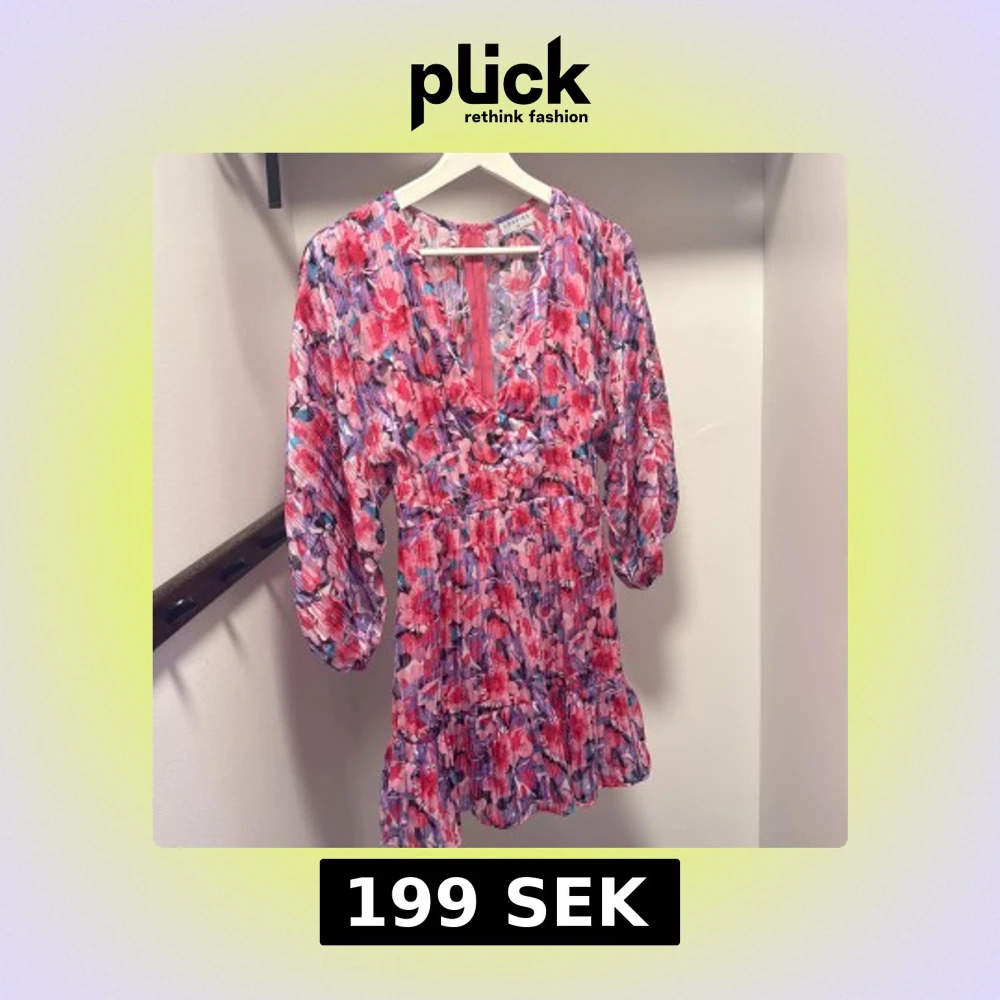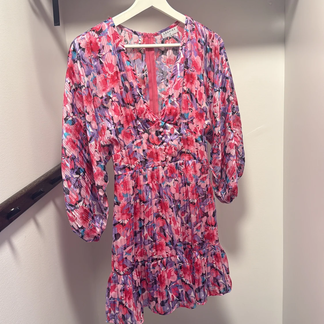 Superfin kortklänning från Loavies i färgstarkt blommigt mönster med rosa, lila och röda toner. Klänningen har v-ringning, volangkant nertill och långa puffärmar. Perfekt för dig som gillar färg och vill sticka ut lite extra!