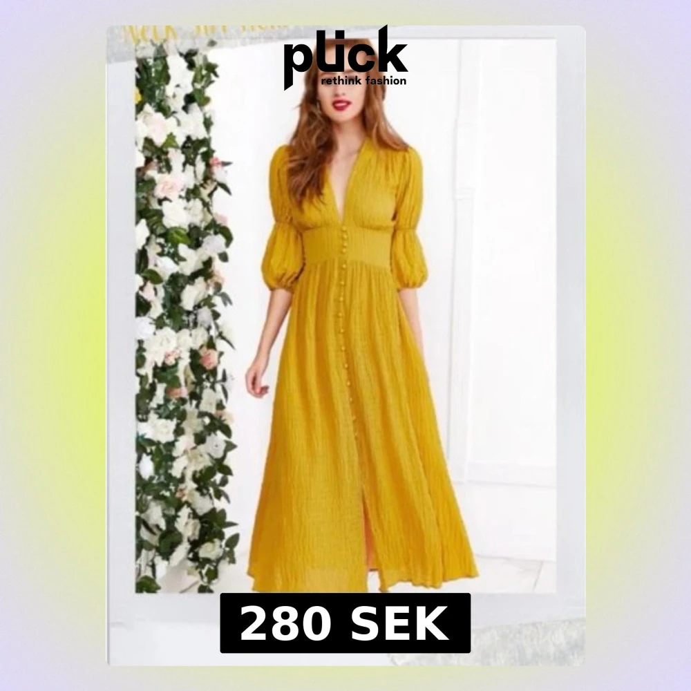 Superfin gul långklänning med djup v-ringning, puffiga trekvartsärmar och knappar framtill. Klänningen har markerad midja och är gjord i ett lätt, strukturerat bomullstyg.