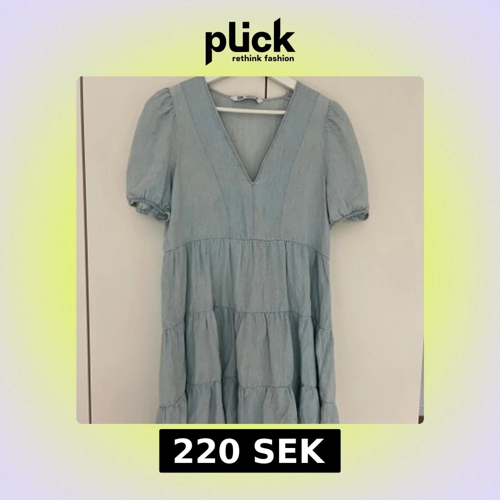 Supersöt ljusblå klänning från Zara med v-ringning och puffärmar. Klänningen har volanger i kjolen och är tillverkad i ett mjukt bomullsliknande material. Perfekt för vår och sommar!