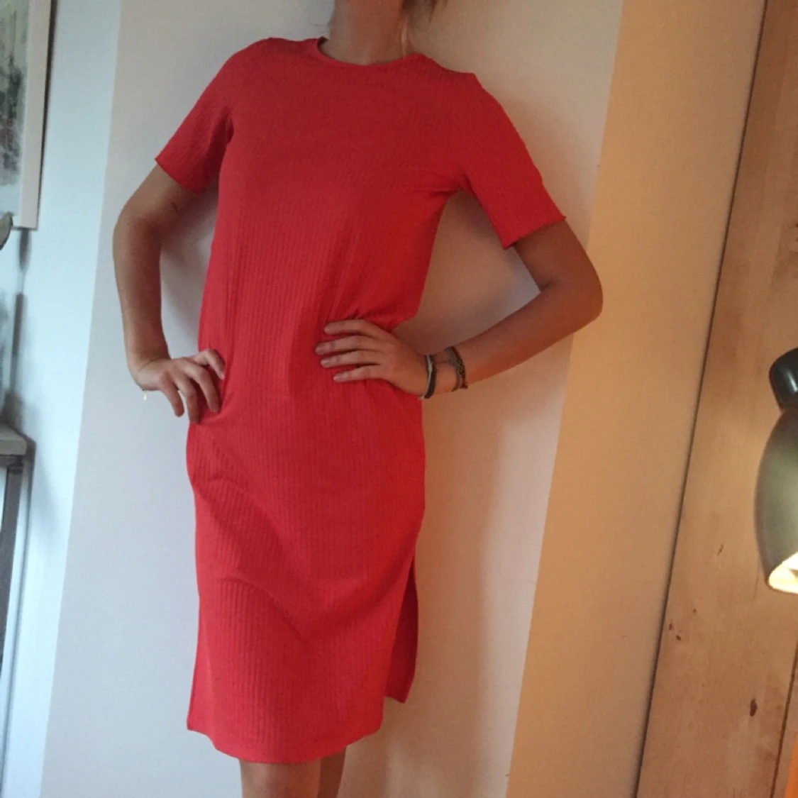 Tshirtklänning från Asos i röd/rosa korallfärg. Två slitsar vid sidorna, köpt i våras och aldrig använd. Storlek 36. Swish och du står själv för frakt! (Jag är 180cm lång)