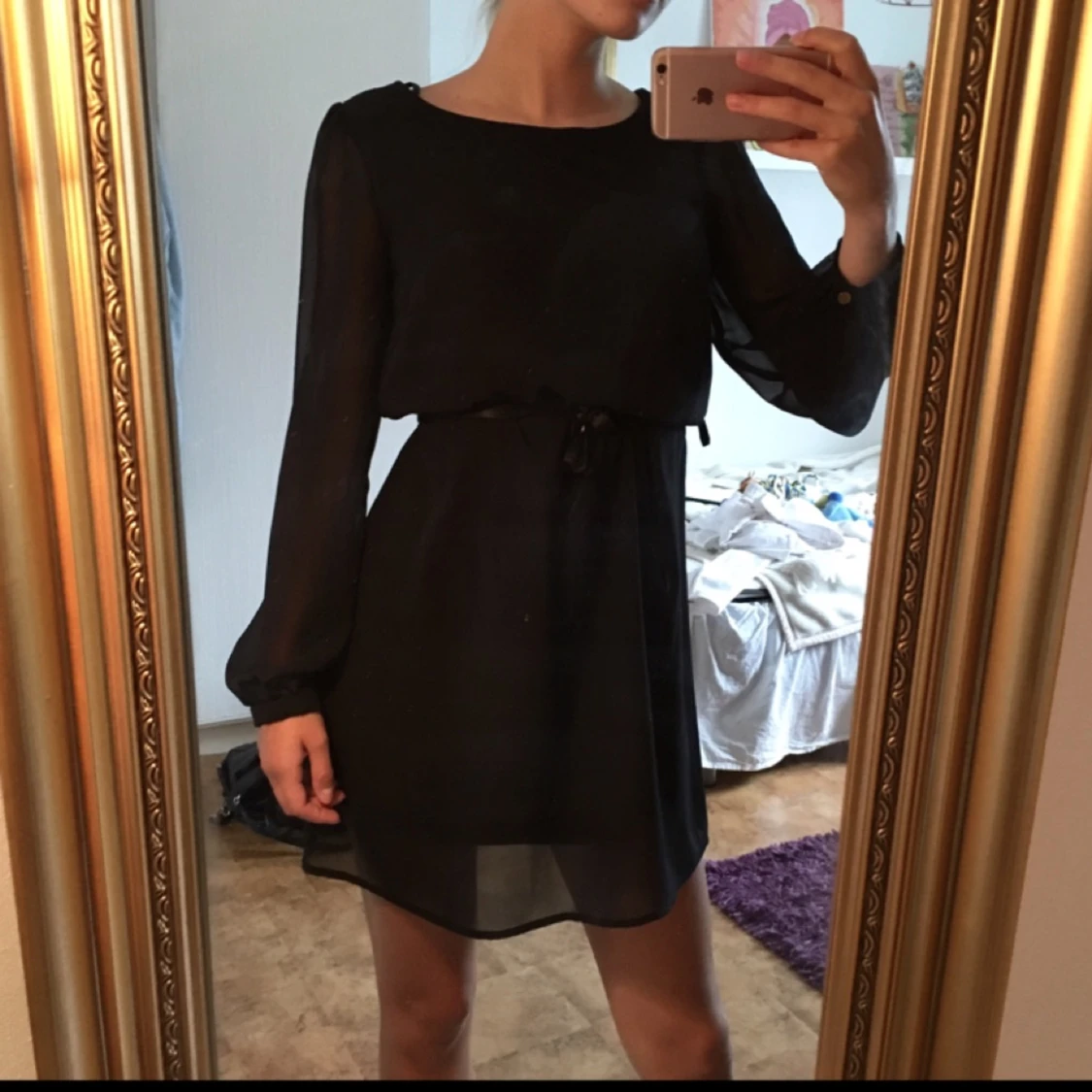 Svart klänning med guldknappar vid rygg och ärmslut som detaljer. Tyget är mesh-aktigt men överallt utom ärmarna finns ett svart undertyg. Köparen står för frakt! (Skärpet på bild 1 ingår ej)