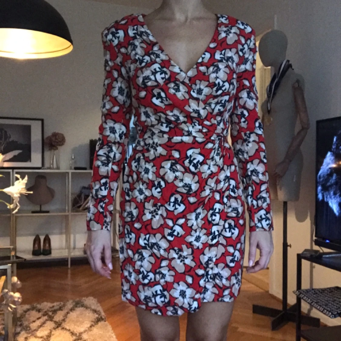 Figursydd klänning ifrån mango. Stängs med dragkedja i ryggen. Kjolen är omlott och har axelvaddar i. Aldrig använt. Jag betalar frakt och har swish